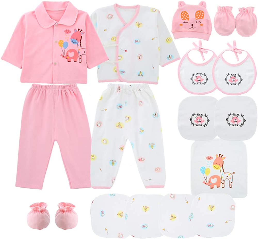 Gender: Unisex Style: Casual Material: 100% organic cotton Target customer: Unisex Newborn, 0-3 Months Includes: 1 * hat, 2 * bib, 2 * shoes, 2 * gloves, 2 * Tops, 2 * Bottoms, 7 * Handkerchief