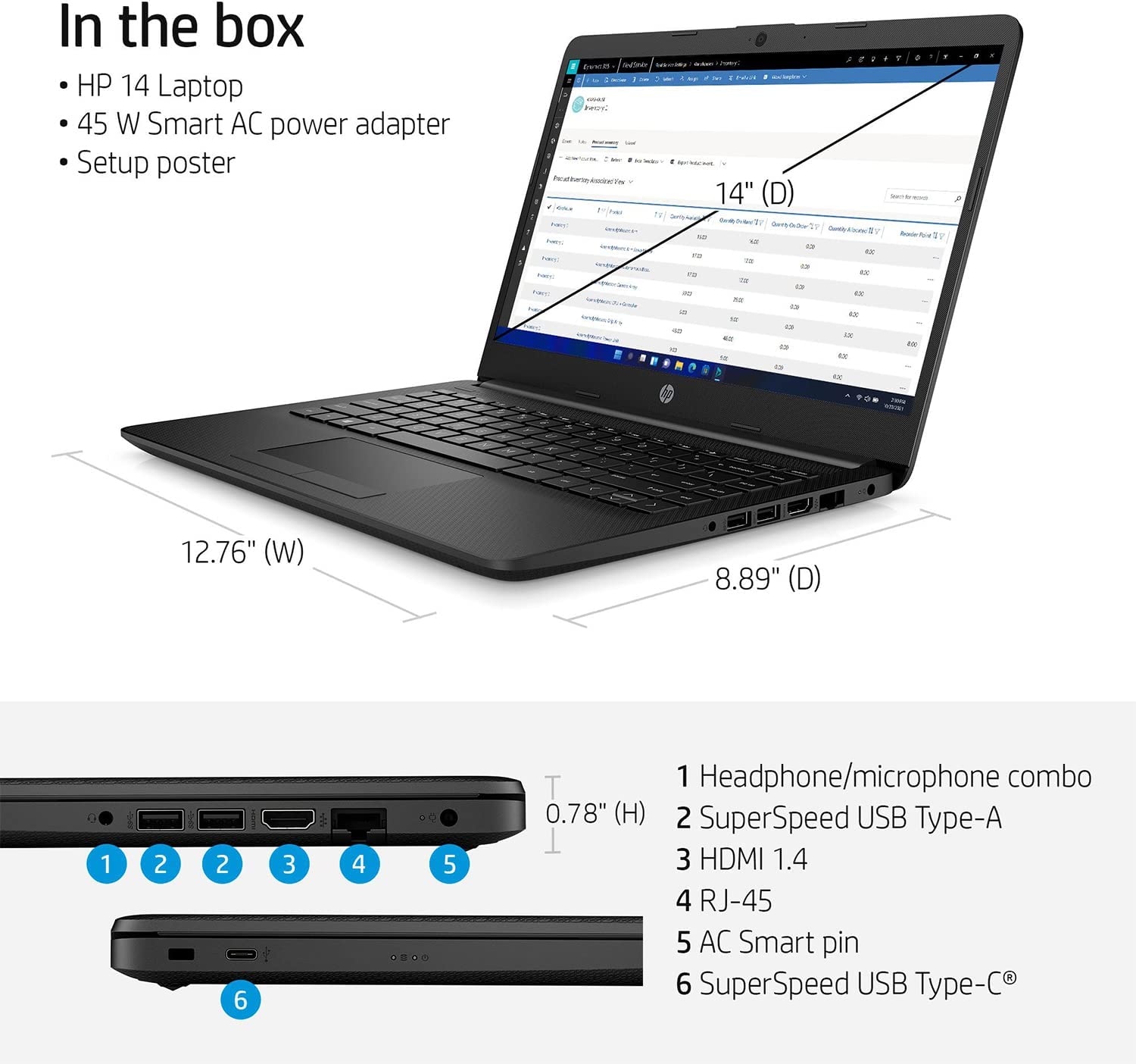 Display: 14" diagonal, HD (1366 x 768), micro-edge, BrightView, 220 nits, 45% NTSC