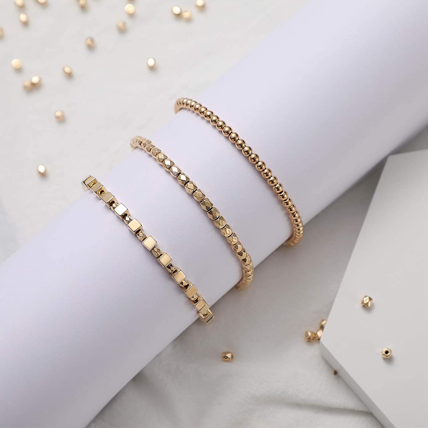 3000 Pieces Assorted Spacer Beads Include 1500 Faceted Rondelle Cube Spacer Column Bead, 900 Round Ball Spacer Bead, 600 Square Spacer Bead Charm Loose Bead for DIY Jewelry (Gold, Sliver, Rose Gold)