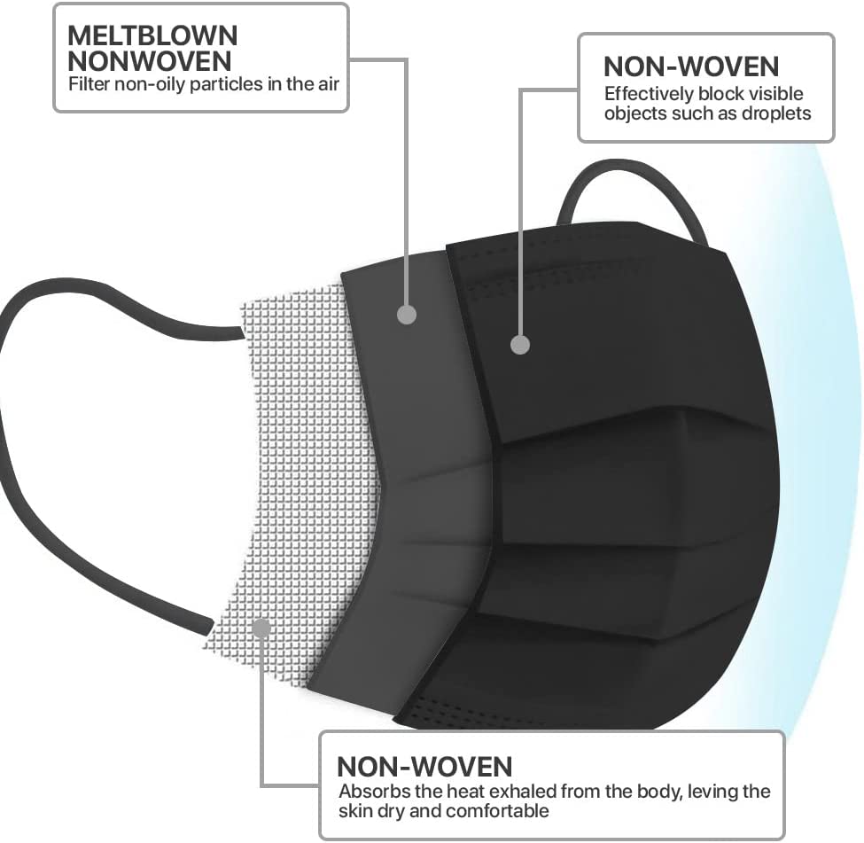 50 PCS Black Disposable Face Masks 3-Ply Filter Earloop Mouth Cover, Face Mask
