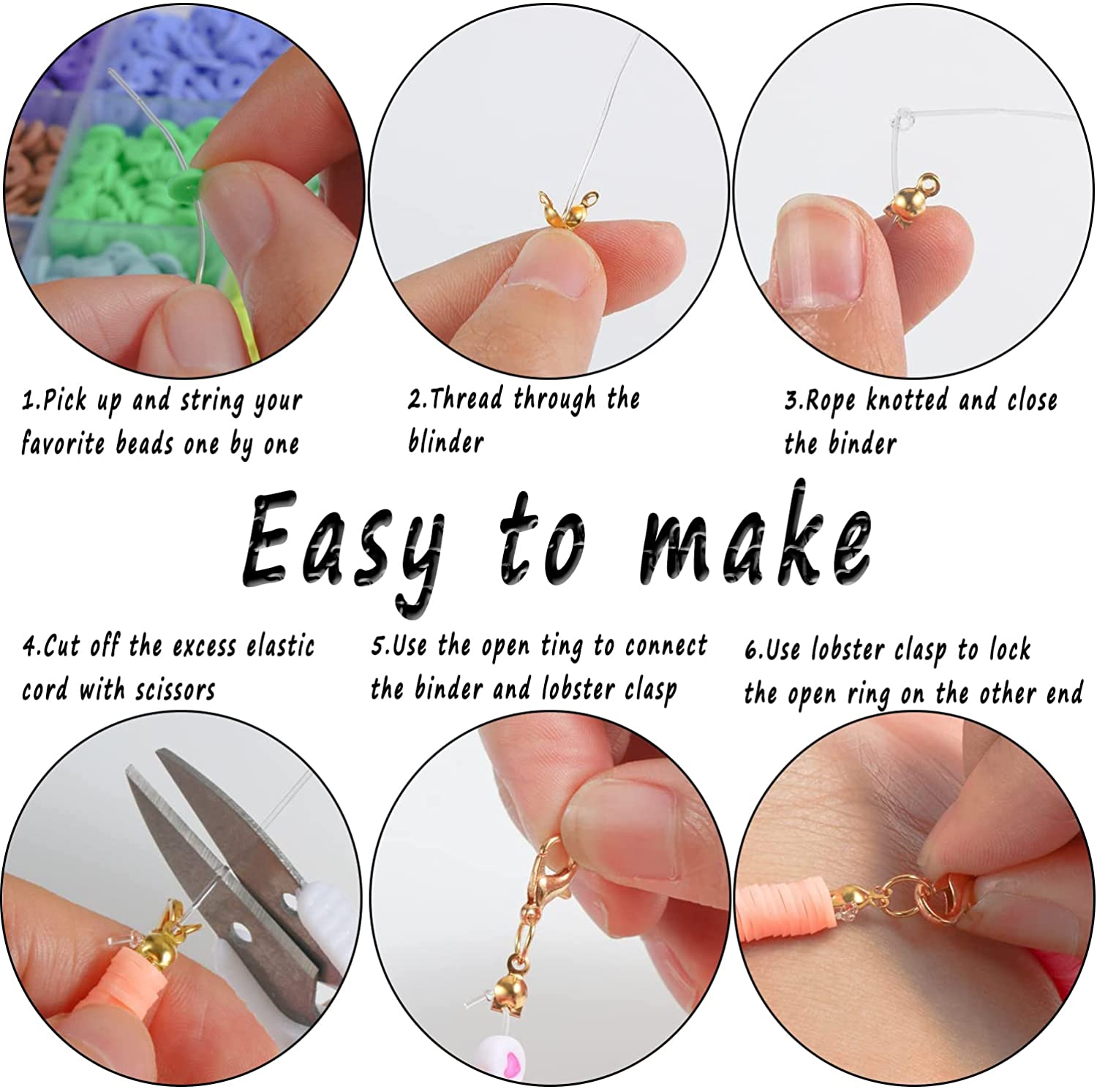 Polymer Clay beads kit includes 4000pcs flat clay beads in 20 colors and 280pcs charms kit (contains pendants, jump rings, 2 set full A-Z letter beads and 8 heart beads, lobster clasp, etc.), 4 rolls of 10 meters elastic strings,300 pcs of thick fruit smile clay beads,150 pcs of colorful eye beads,150 pcs small beads,15 pcs unicorn mermaid pendant.