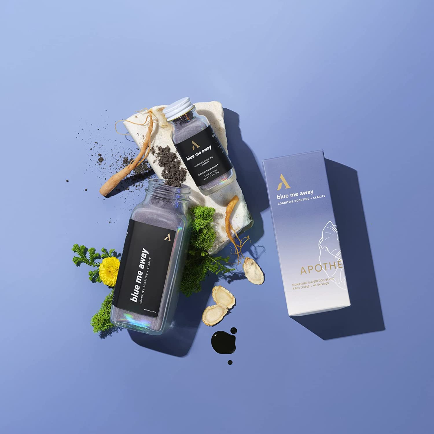 Blue Me Away is a caffeine-free herbal powder blend that boosts mental clarity, provides lasting energy, and helps address stress. Chlorella and Ginseng, two powerhouse adaptogens, help reduce cortisol and aid in the body’s detoxification process. With its creamy and slightly bitter matcha flavor, enjoy this like you would a hot cup of green tea.