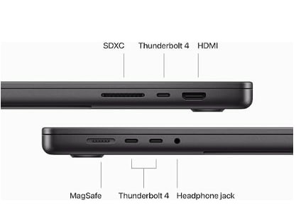 • CONNECT IT ALL — This MacBook Pro features a MagSafe charging port, three Thunderbolt 4 ports, an SDXC card slot, an HDMI port, and a headphone jack. Enjoy fast wireless connectivity with Wi-Fi 6E and Bluetooth 5.3. And you can connect up to two external displays with M3 Pro, or up to four with M3 Max. (Wi‑Fi 6E available in countries and regions where supported.)