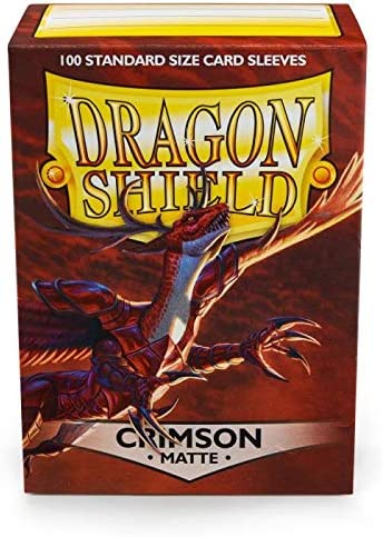 "Clear front & Matte Crimson back. The royal flames of duty and honor. Matte sleeves are our popular line of textured Dragon Shield with superior handling. A perfect mix of durability and shuffle-ability. The professor's #1 pick for card sleeves. The sturdy cardboard box fits 75+ single sleeved cards or 65+ double sleeved cards. Every box has a label at the top of the box for personalization. PVC-free polypropylene sleeves, no acid. Archival safe. Matte 120 μm quality thickness. For cards measuring up to 63x88 mm's (2½""x3½"")."