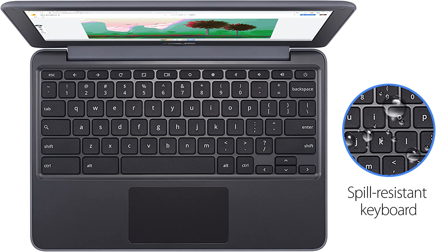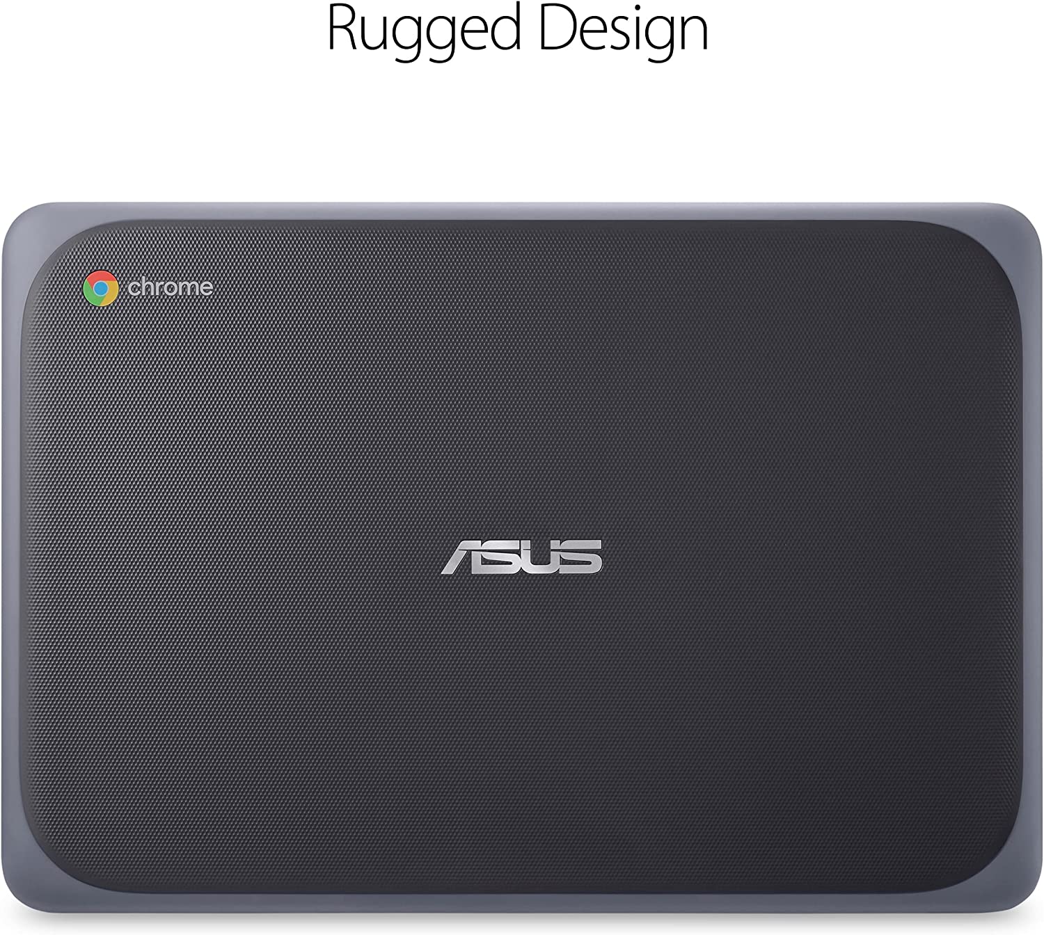 The ASUS Chromebook C203, a rugged K-12 11.6” Chromebook featuring a 180-degree screen, spill-resistant keyboard, and USB Type-A / Type-C connections.