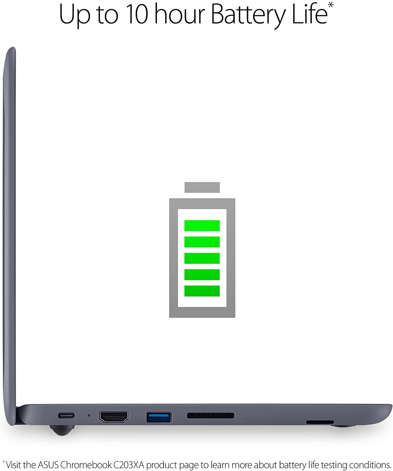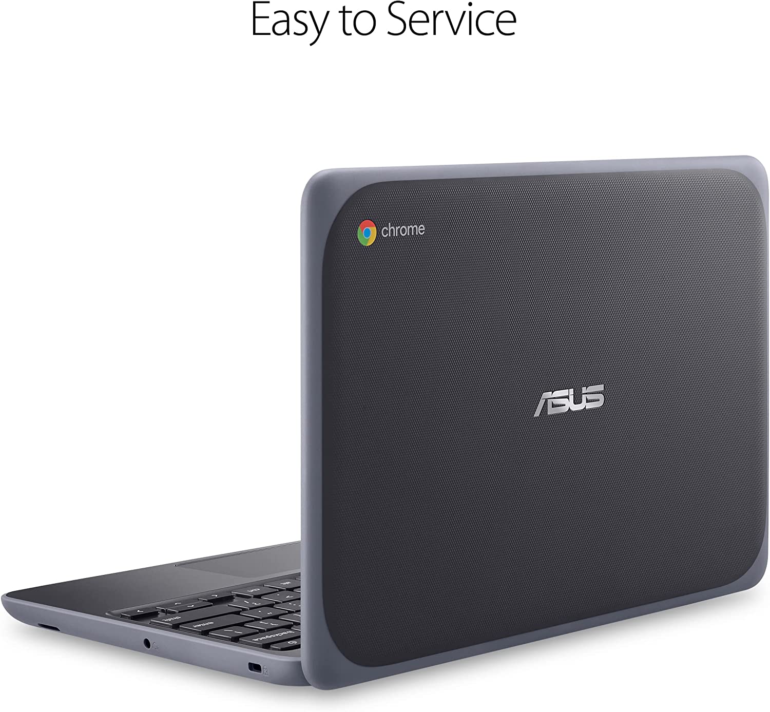 The ASUS Chromebook C203, a rugged K-12 11.6” Chromebook featuring a 180-degree screen, spill-resistant keyboard, and USB Type-A / Type-C connections.