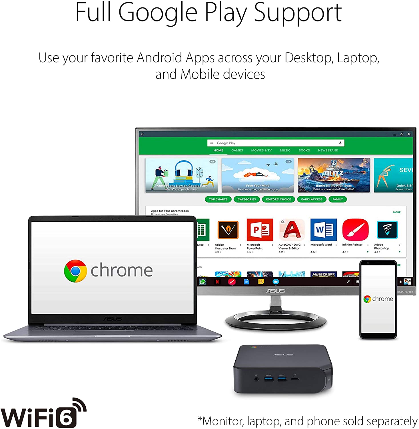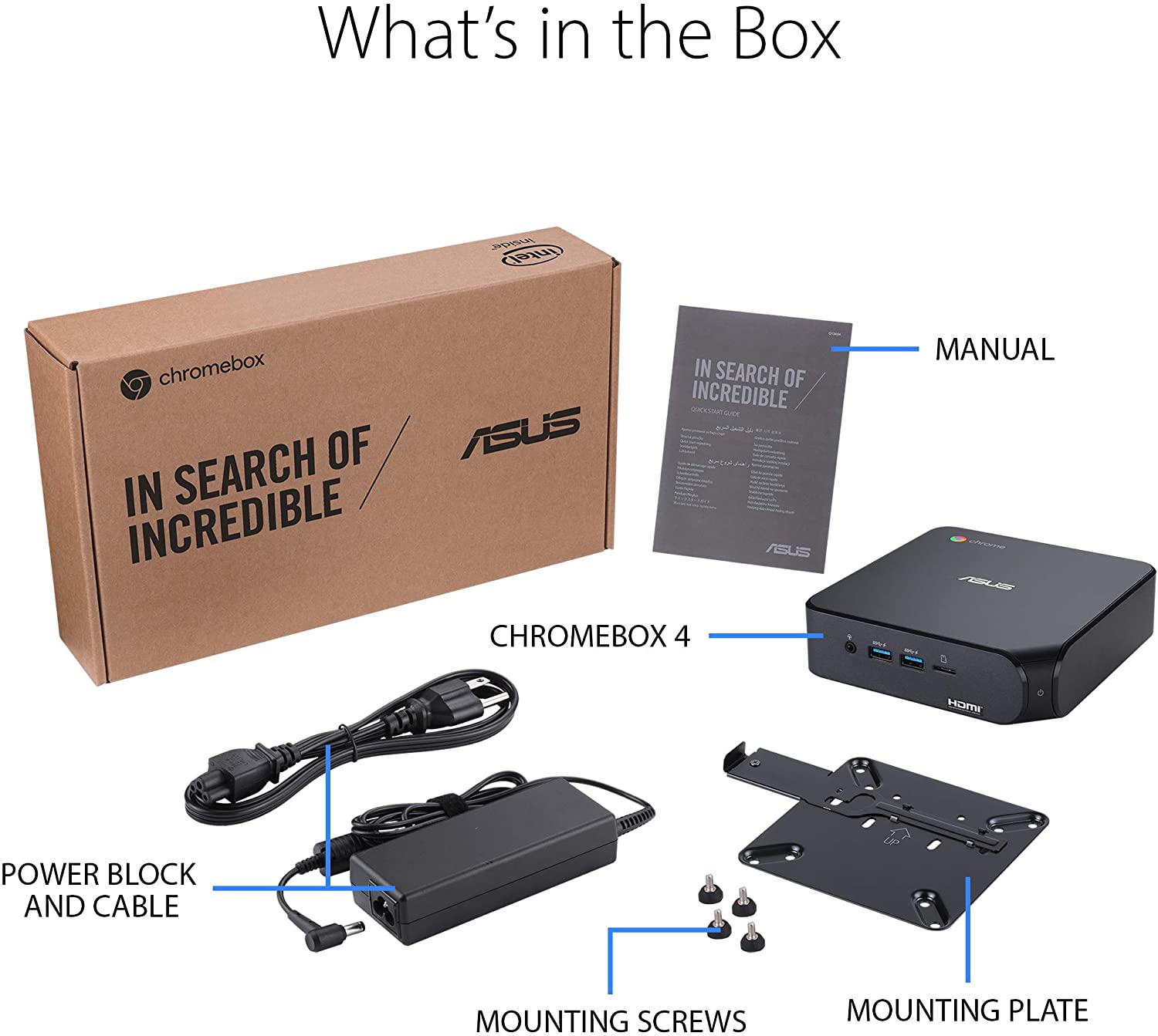 ASUS Chromebox 4 features Intel Celeron 5205U processor and DDR4-2400 memory for faster, smoother and more energy-efficient performance. It supports up to three 4K displays and is equipped with a versatile USB-C port that enables power delivery and DisplayPort connections. Enjoy Google-enabled apps with WiFi 6 for ultrafast network speeds.