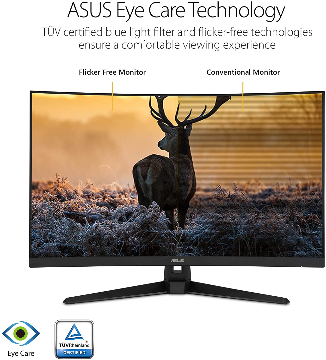 Designed for fast-paced games, the TUF Gaming VG328H1B is a 32” curved gaming display that boasts a 165Hz refresh rate. The VG328H1B features Extreme Low Motion Blur (ELMB), which eliminates motion blur for a smoother gaming experience, and FreeSync Premium technology, which eliminates screen tearing and choppy frame rates.