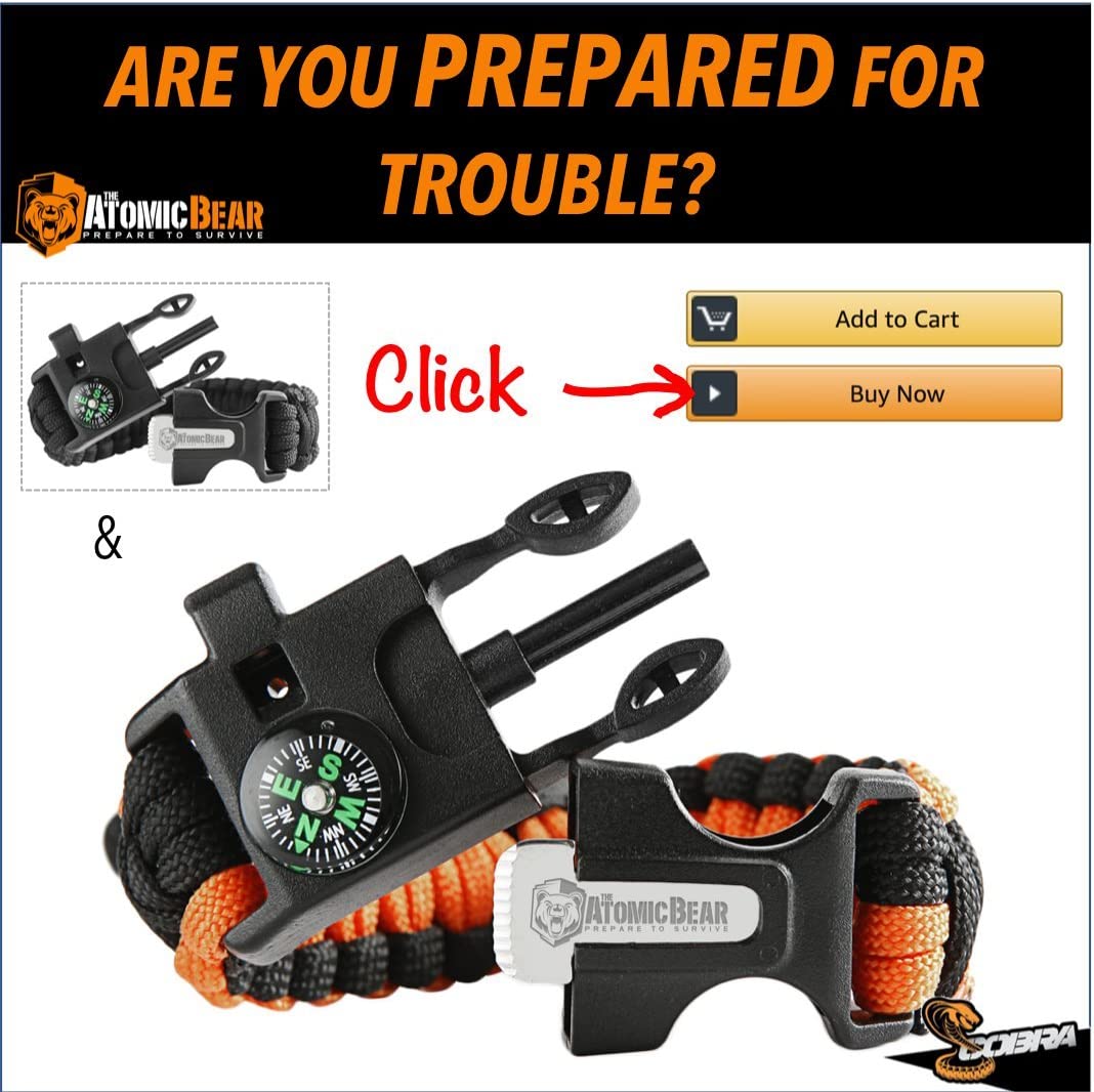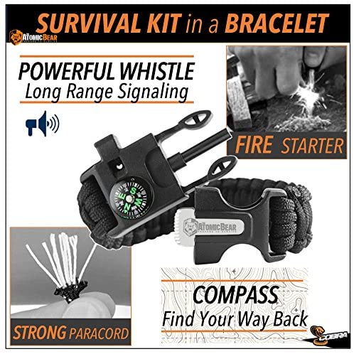 Atomic Bear Paracord Bracelet (2 Pack) - Adjustable - Fire Starter - Loud Whistle - Perfect for Hiking, Camping, Fishing and Hunting - Black & Black+Orange
