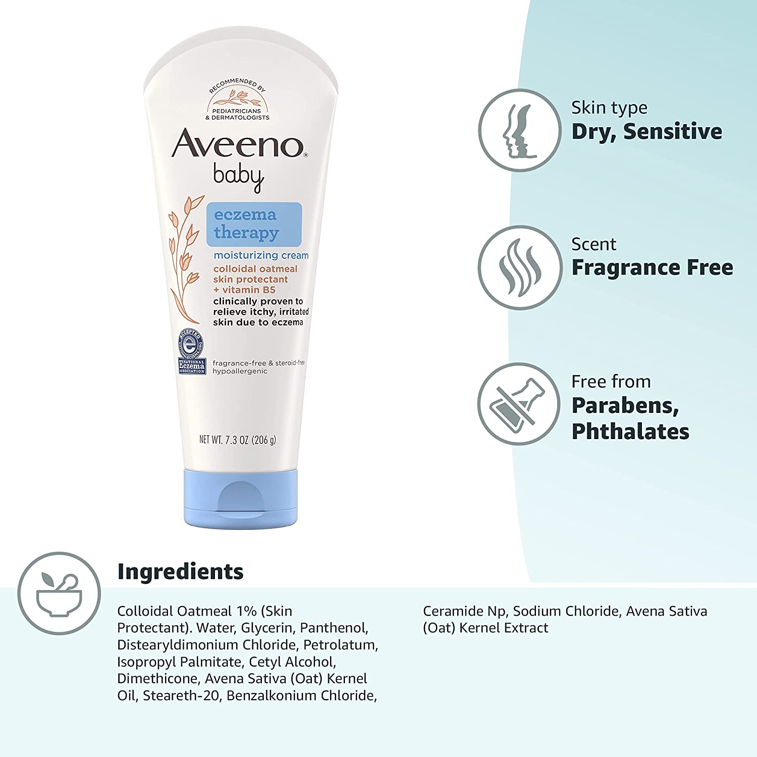 Aveeno baby eczema therapy moisturizing cream helps relieve dry, itchy, irritated skin due to eczema. Developed with leading dermatologists, this hypoallergenic baby eczema cream uses the soothing power of natural colloidal oatmeal to help strengthen the skin's moisture barrier for prevention and protection against dryness. Formulated specially for babies, this non-greasy baby cream is clinically proven to relieve itchy, irritate skin due to eczema and intensely moisturizes skin to prevent the recurrence of extra dry skin from eczema. The unique formula, made with Natural Colloidal Oatmeal skin protectant and vitamin B5, is pH-balanced and free from steroids, fragrances, parabens, phthalates and phenoxyethanol. Aveeno is recommended by pediatricians and dermatologists and this cream is accepted by the National Eczema Association.