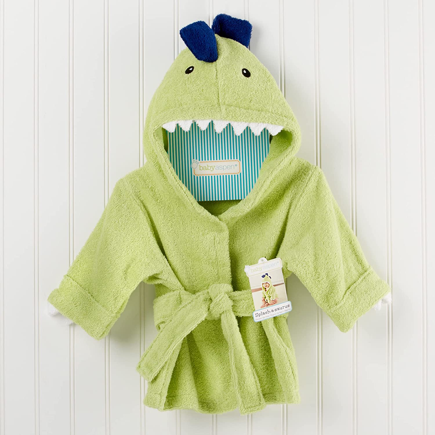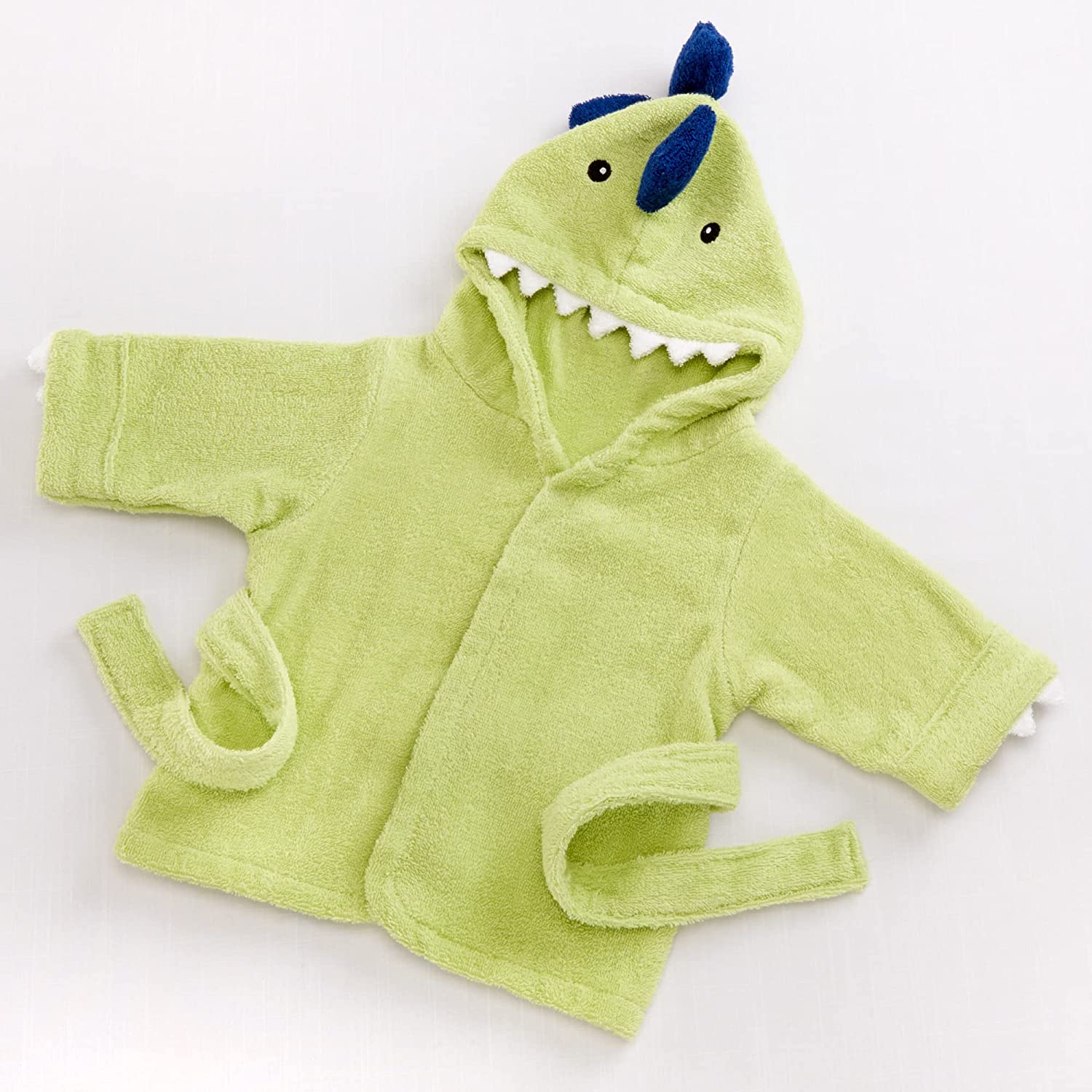 When dinosaurs roamed the earth, they were nowhere near this huggable! A new baby is in for some prehistoric pampering after every bath--just tell the new mom and dad you dinosaur it--and knew baby had to have it! Features and facts: Jurassic-green, hooded spa robe with embroidered black eyes, black, 3-D dyno "spikes", pearly-white terry dyno-teeth and attached belt closure. Machine-washable terry cloth. Size 0-9 months.
