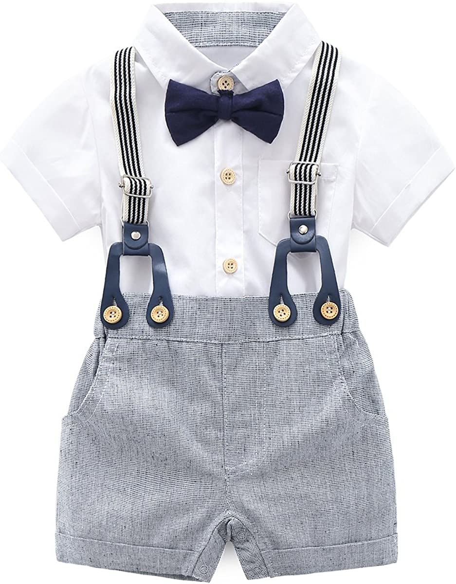 Baby Boys Gentleman Outfits Suits, Infant Short Sleeve Shirt+Bib Pants+Bow Tie Clothes Set