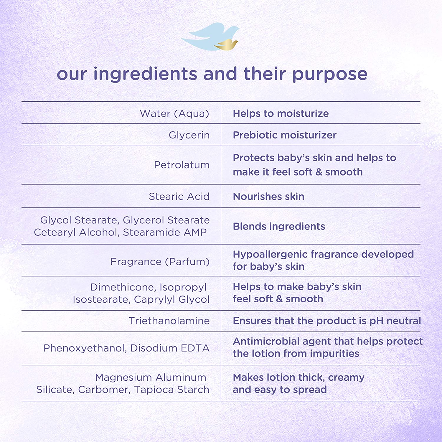 Looking for ways to help your baby sleep through the night? For experts and real parents, the key is sticking to a routine. Using baby body lotion with a calming scent can be key to your baby's sleep routine. That's why we formulated Baby Dove Calming Moisture Hypoallergenic Baby Lotion with a soothing scent to help baby wind down at bedtime while nourishing their delicate skin overnight. A gentle massage before bed is a great way to soothe your little one while nourishing their skin as your baby sleeps. And with a calming chamomile scent, this baby lotion is the perfect addition to baby’s nighttime routine. This scented lotion offers more than the gentle touch needed to care for delicate baby skin. It's made with 100% skin-natural nutrients, which are identical to those naturally found in skin, and prebiotic moisture to help replenish the essential moisture and nutrients that baby’s skin can lose overnight. The ultra-gentle, hypoallergenic formula is also created free from dyes, parabens, and phthalates. After washing your baby with Baby Dove Calming Moisture Hypoallergenic Wash and then drying, warm Baby Dove Calming Nights Baby Lotion in your hands and gently massage onto their body to nourish baby skin. We know there’s no right or wrong way to be a parent – only your way. That’s why Baby Dove is here to help give you confidence that you’re providing the best skin care for your baby's skin. Our Calming Moisture Hypoallergenic Baby Lotion is sold in 13 oz. and 20 oz bottles. Looking for something for extra sensitive skin? Look for Baby Dove Fragrance-Free Moisture Hypoallergenic Lotion.
