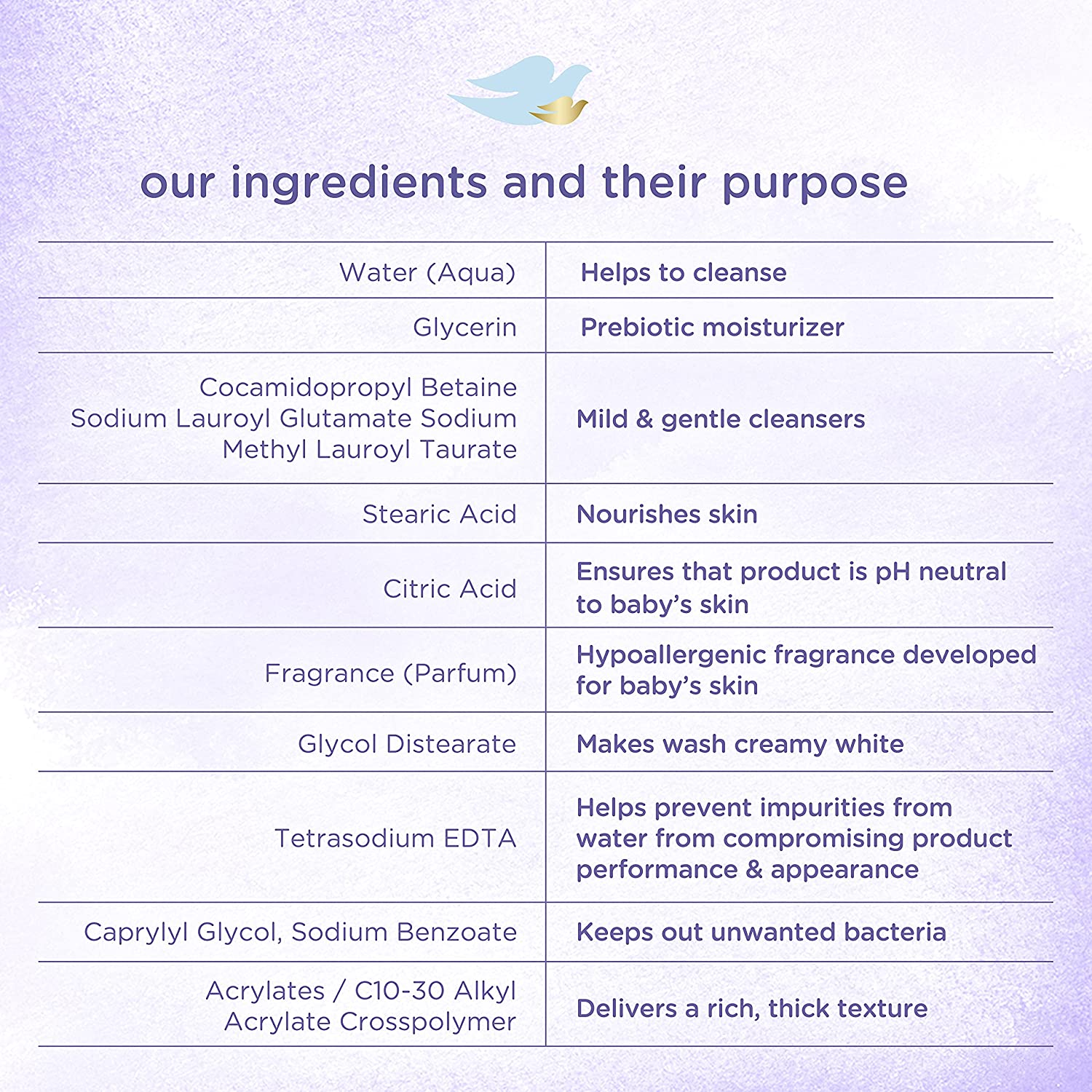 Looking for ways to help your baby sleep through the night? For experts and real parents, the key is sticking to a routine. A warm bath followed by a gentle massage can be key to your baby's sleep routine. That's why we formulated Baby Dove Calming Moisture Hypoallergenic Baby Wash with a soothing scent to help baby wind down at bedtime while nourishing their delicate skin. Baby bath time is a good time to start getting your little one ready for bed. And with a calming chamomile scent, this gentle baby wash is the perfect addition to baby’s nighttime bath. Tear-free and hypoallergenic, it goes beyond mildness to cleanse and care for baby’s delicate skin. This soothing baby bath wash is made with 100 percent skin-natural nutrients, which are identical to those naturally found in skin, and prebiotic moisture to help replenish the essential moisture and nutrients that baby’s skin can lose during bath time. And our caring baby wash and shampoo formula is created without dyes, parabens, phthalates, or sulfates and safety-tested and pediatrician recommended. With a rich and creamy lather, this baby wash leaves your little one feeling clean, soft, and ready for bed. And then hopefully you’ll be able to relax too, rather than wondering how to put a baby to sleep. We know there’s no right or wrong way to be a parent – only your way. That’s why Baby Dove is here to help give you confidence that you’re providing the best skin care for your baby's skin. Our Calming Moisture Hypoallergenic Baby Wash is sold in 13 oz. And 20 oz. bottles. Looking for something for extra sensitive skin. Look for Baby Dove Fragrance-Free Moisture Hypoallergenic Wash.
