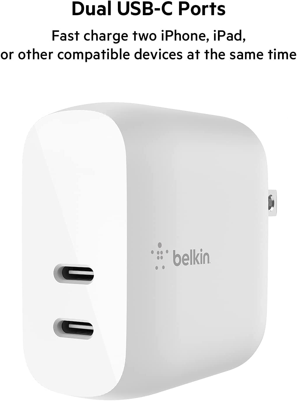 Give two compatible devices a fast charge at the same time with our Dual USB-C PD Wall Charger 40W. This USB-C PD certified charger delivers 20W of power from each USB-C port, charging an iPhone 12 from 0-50% within 25 mins* and an iPad from 0-50% in 40 mins†. Plus, it’s travel-ready with its compact design and foldable prongs (US and China only), making it the perfect choice for home, the office, and on the road. Our dual-port charger is also universally compatible with the latest USB-C PD enabled smartphones and tablets—including Apple, Google, Samsung, and more—giving you a safe and fast charge for all your devices.