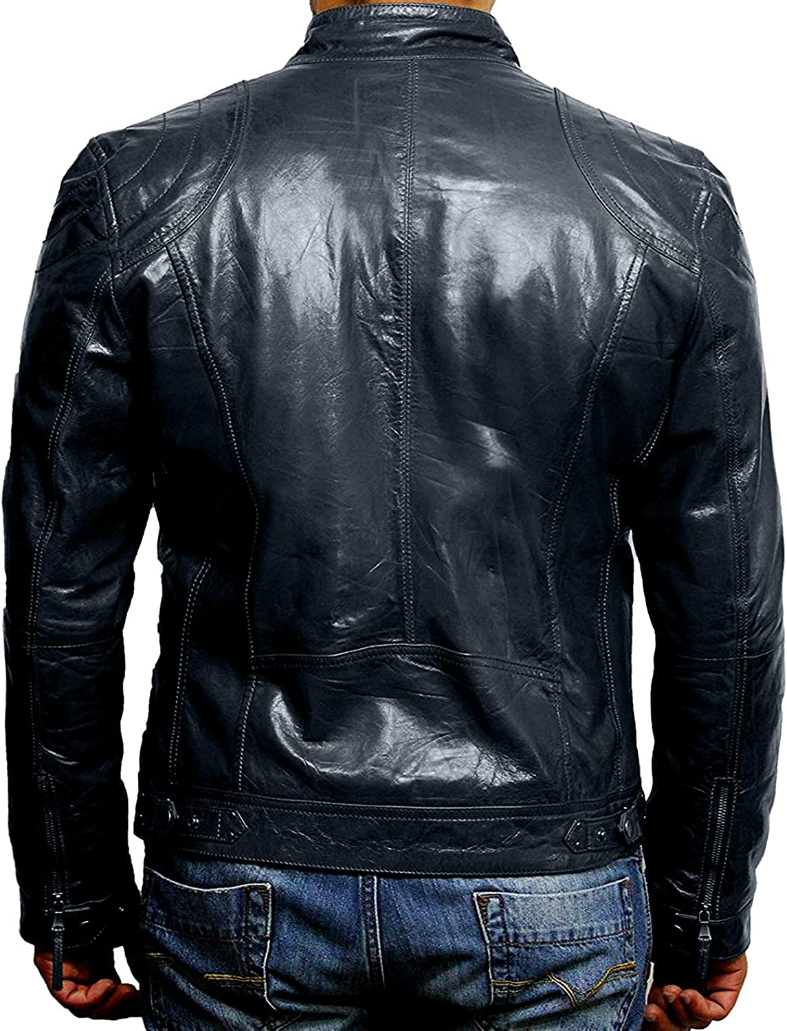 Black Leather Jacket Mens - Cafe Racer Real Lambskin Leather Distressed Motorcycle Jacket