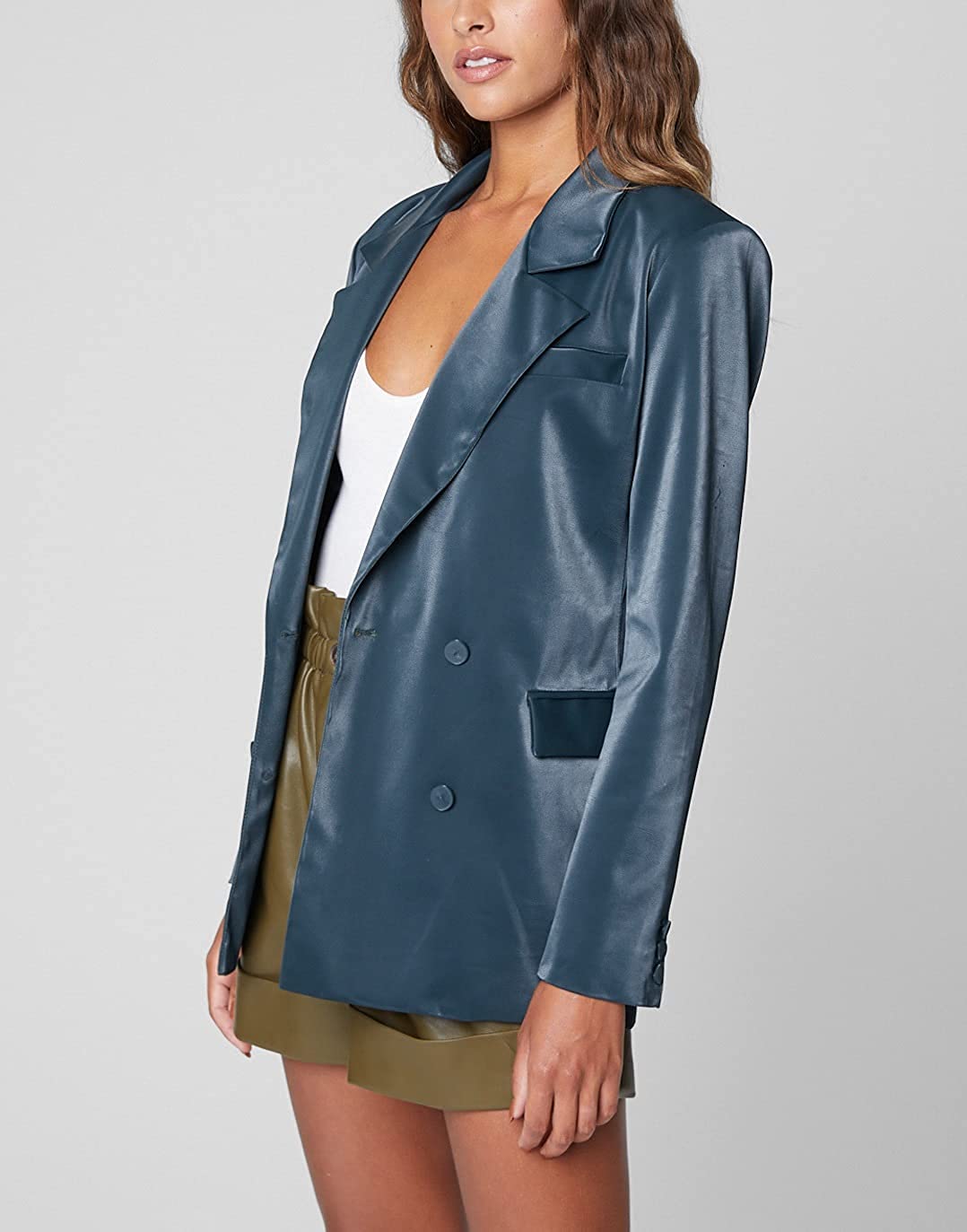 [BLANKNYC] Womens Vegan Leather Double Breasted Blazer, Comfortable Jacket & Stylish Coat
