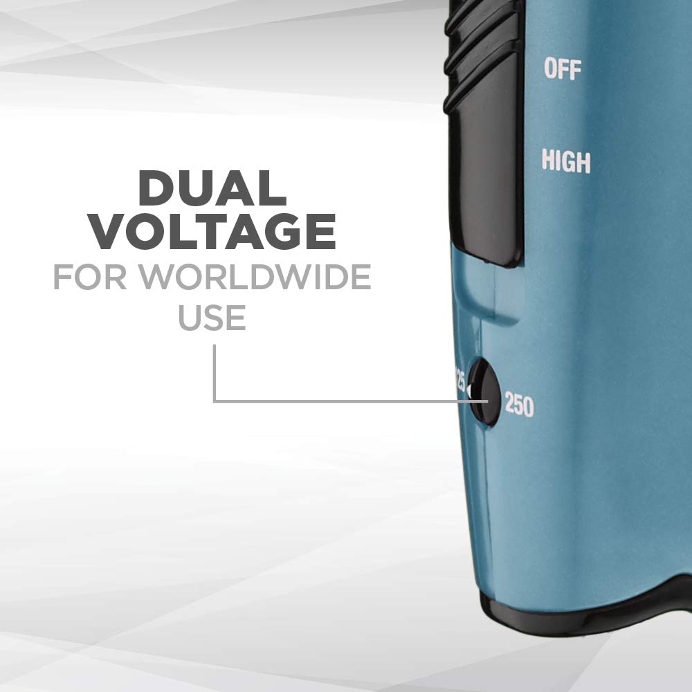 The Conair 1875 Watt Ionic Conditioning Cord-Keeper Hair Dryer with Folding Handle in Teal has a cord which retracts at the push of a button for easy storage. Keep things tidy and tangle-free with this 1875 Watt Hair Dryer. The folding handle is perfect for easy packing, compact storage and jet-setting travel. This powerful and lightweight hair dryer has Ionic Conditioning for smooth, shiny-looking hair and less frizz. The Tourmaline Ceramic Technology in this dryer for hair produces infrared heat, which gently dries hair quickly while ultimately reducing heat damage. 2 heat/speed settings for custom air flow and a Cool Shot locks style in place. In addition to the folding handle and retractable cord, this dryer is Dual Voltage, which makes this hair dryer excellent for worldwide travel. Refer instruction manual before use.