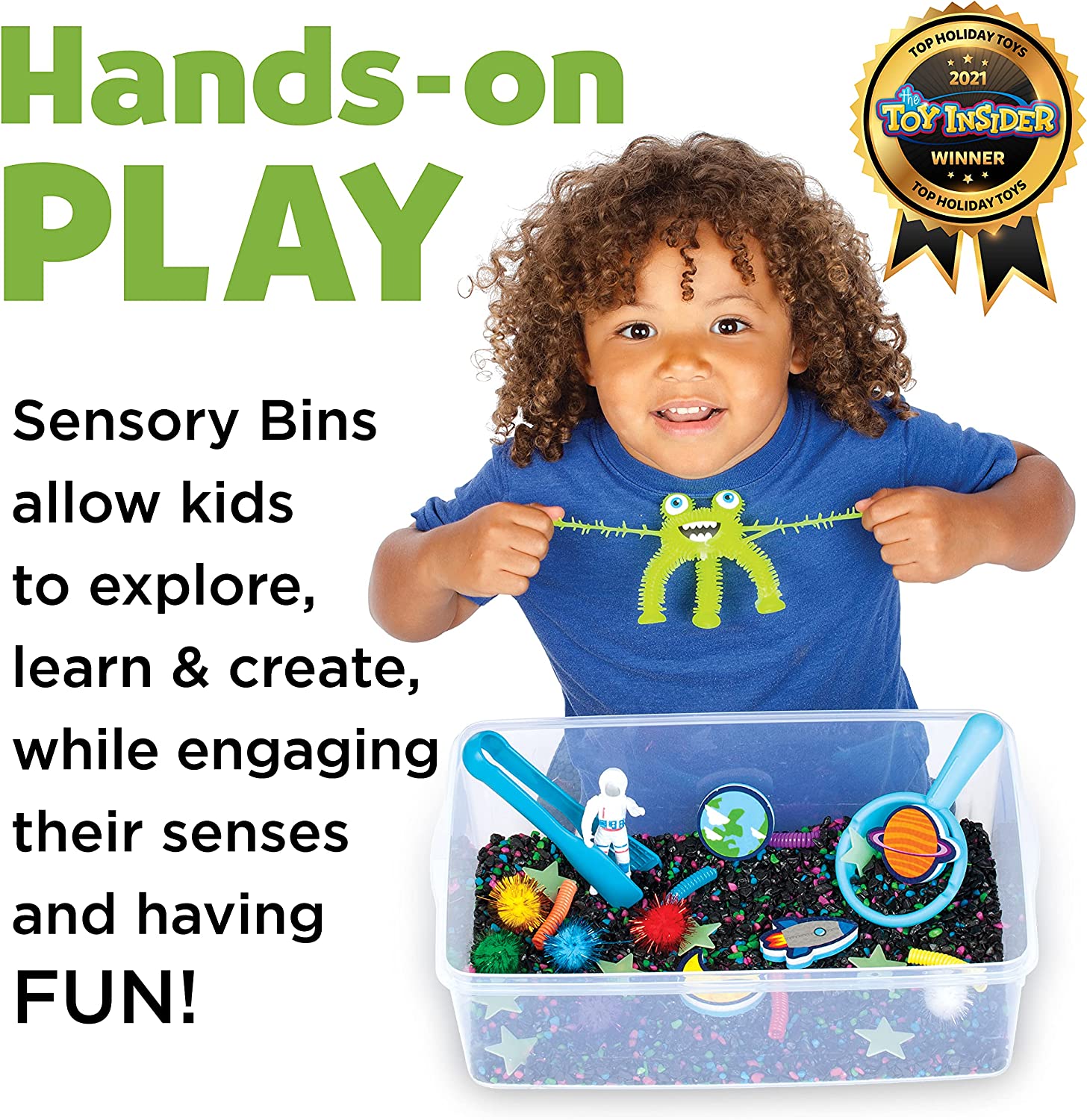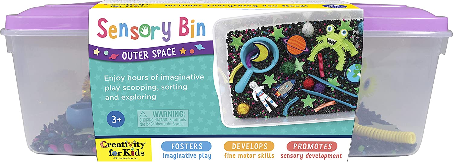 Explore an intergalactic world as you scoop, discover and learn while engaging your senses with the Creativity for Kids Outer Space Sensory Bin. This self-contained space toy bin is an out of this world sensory experience - just add imagination for an engaging creative, hands-on play activity for kids. Sensory Bins allow toddlers to discover, imagine, learn and create, while engaging their senses and having FUN! Materials are carefully selected (and safety-tested!) to provide the best hands-on play experience. Scoop, sort and explore in this self-contained sensory bin. Sensory Bins provide many learning benefits and resources for children to build fine motor skills, promote sensory development and encourage imaginative play. For easy cleanup, place your sensory bin on a table cloth, towel or play mat and scoop, sort, dig and build for endless hours of hands-on imaginative play! All sensory bin fillers are carefully selected and safety tested to provide the best at home play activity. This complete sensory toy activity play set includes: 2.5 lbs of outer space rocks, tongs, scoop and fun sensory bin fillers such as squishy alien, astronaut, foam planets, glow in the dark stars, spirals and sparkly pom poms all conveniently packed in a bin with lid for easy storage (Bin measures approx. 14.5" W x 10.25" L x 4.75" H). When your family is done playing and engaging with the sensory bin upcycle it by planting flowers or storing small toys and keepsakes inside, crafters can also recycle their bin to do their part in saving our Earth! Have fun while building creative confidence with sensory play! Since 1976, Creativity for Kids has proudly made fun and creative experiences today to nurture children's confidence for life. The Creativity for Kids Sensory Bin Activity kit - Outer Space fine motor skills toy is recommended for toddlers and preschoolers 3 years old and up.