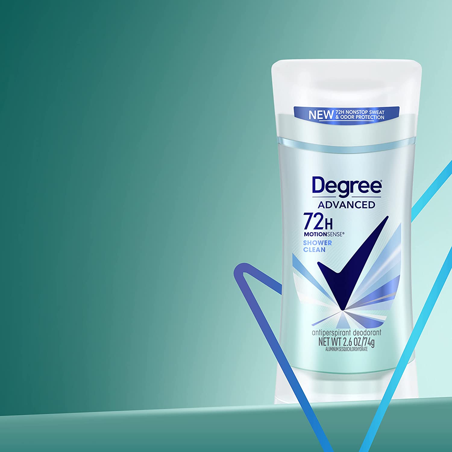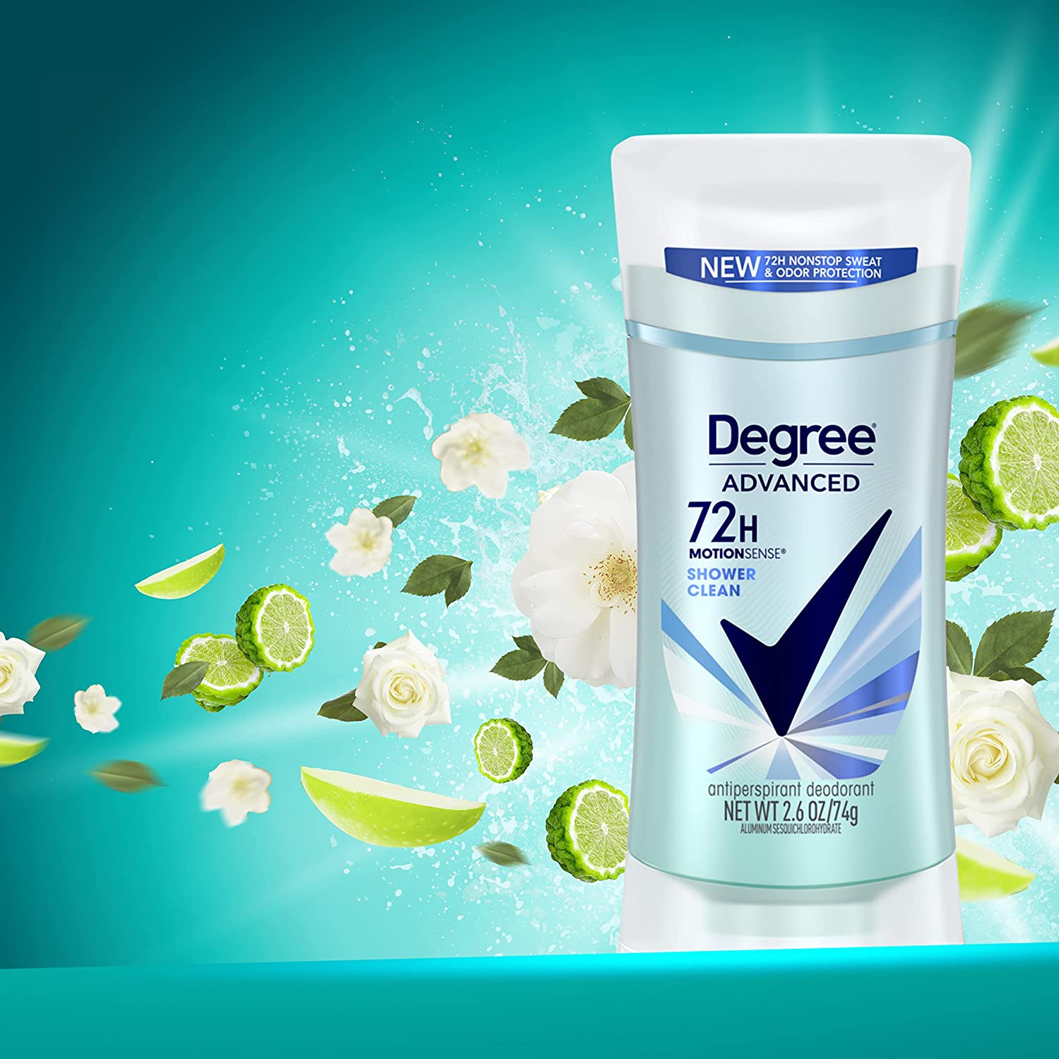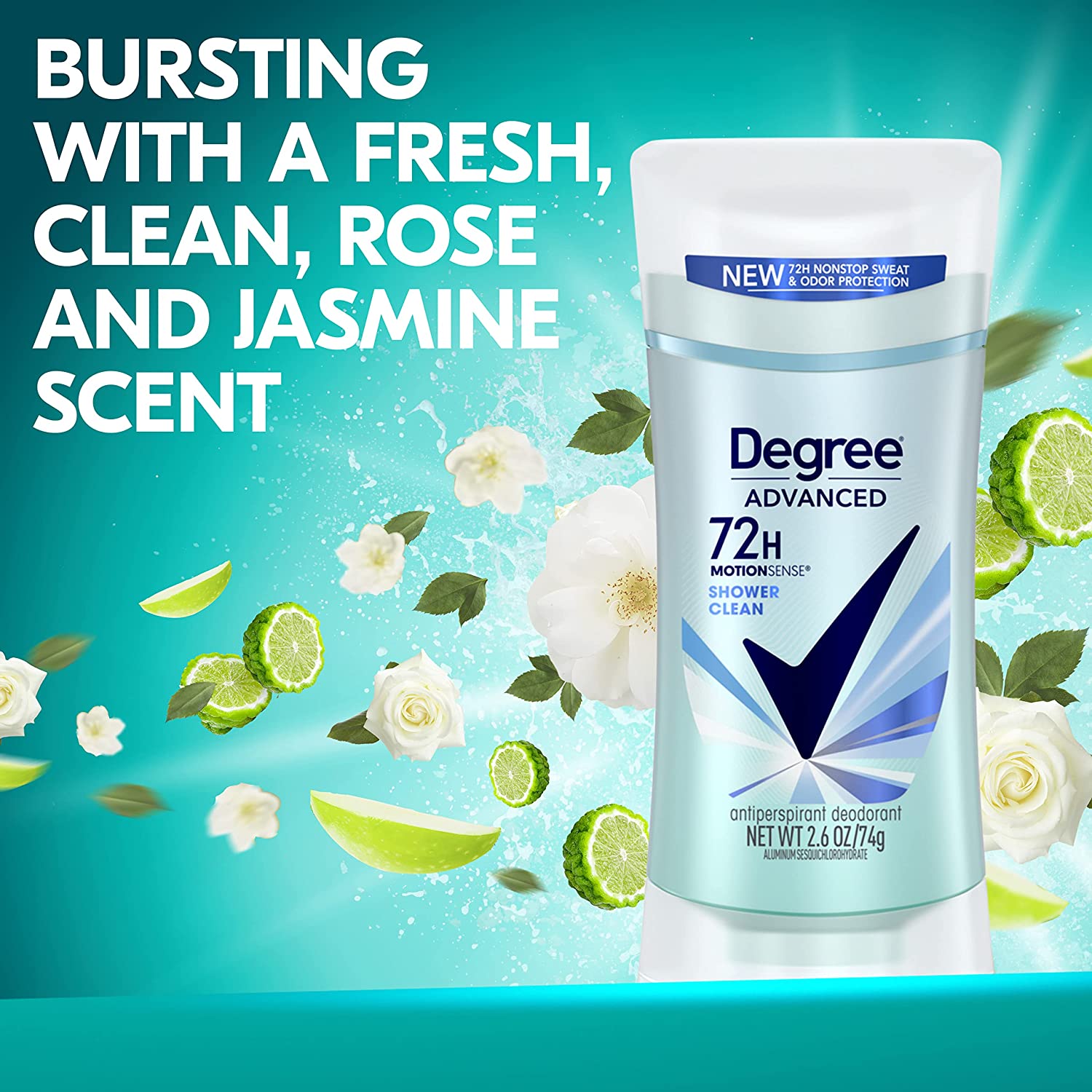 Degree is upgrading to our best formula yet. Our new and improved formulation gives you 72 hours of nonstop sweat and odor protection. You will still find all the same fragrances you know and love, but now with our new and improved long lasting protection! For a limited time, you may still receive our old 48-hour formulation while all our new 72-hour products make their way to a store near you. Degree Advanced Shower Clean Antiperspirant Deodorant delivers nonstop protection, so you can face the day with confidence. This antiperspirant for women features 72-hour sweat and odor protection and the bright floral scent of rose and jasmine, blended with delicate fruit for an invigorating, clean feeling. Only Degree has MotionSense technology that moves in sync with your body. This antiperspirant deodorant spray releases a burst of subtle fragrance every time you move, for nonstop protection. Degree Advanced Shower Clean Antiperspirant Deodorant keeps you feeling fresher, drier, and more confident. This powerful antiperspirant deodorant responds when you need it most so that you don't have to worry about slowing down. Simply swipe and start moving.