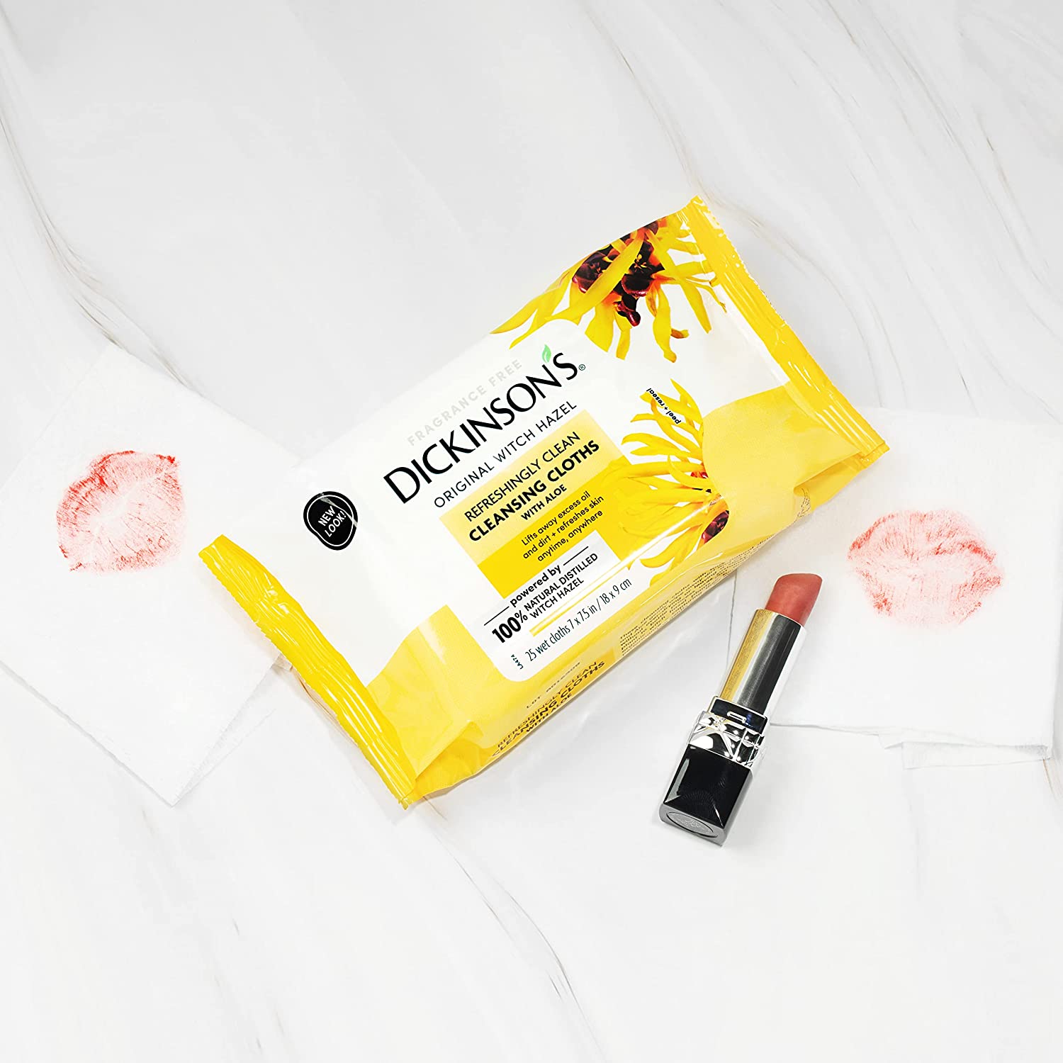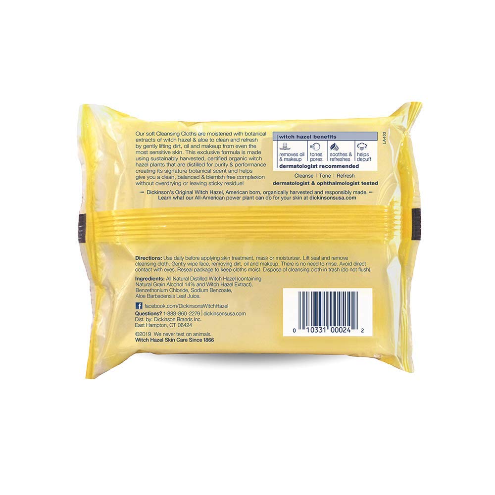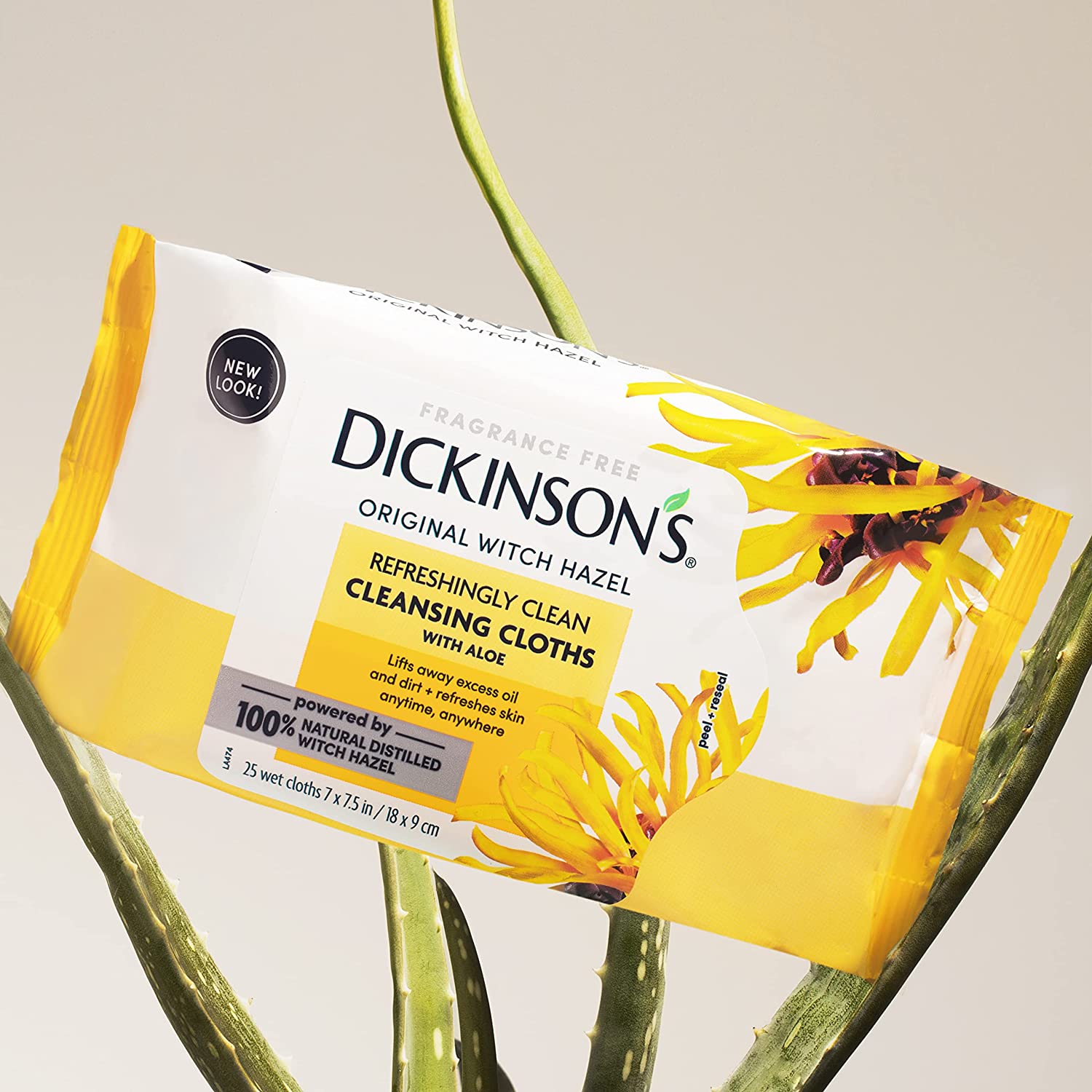 Dickinson's Original Refreshingly Clean Daily Cleansing Cloths combine a soothing blend of witch hazel, aloe, and botanical extracts for a clean, balanced, and blemish-free complexion. Our exclusive formula is 99% natural and succeeds by gently lifting dirt, oil, and makeup from even the most sensitive of skin, all without leaving sticky residue or overdrying. This order includes a package of 25 extra-large, extra-soft cloths. For more than 150 years, natural witch hazel has been the primary ingredient in all of Dickinson's products for truly effective skincare solutions. They'll help to leave your skin feeling healthy and hydrated (and without harsh or confusing ingredients). Only the pure essence of peak-bloom, hand-harvested, and organic-certified New England witch hazel makes its way into our products. Dickinson's also leaves a positive impact on the environment, all while offering products which gently cleanse, tone, and refresh to purify all skin types. A pure clean for a pure, beautiful you: that is the genuine promise of Dickinson's.