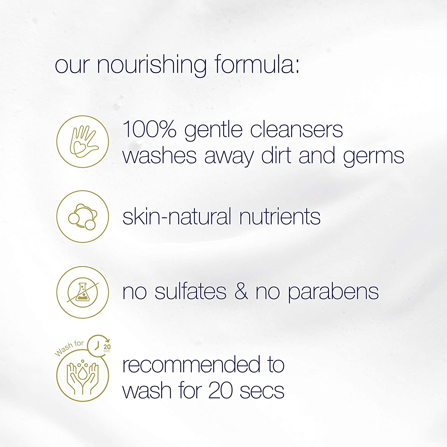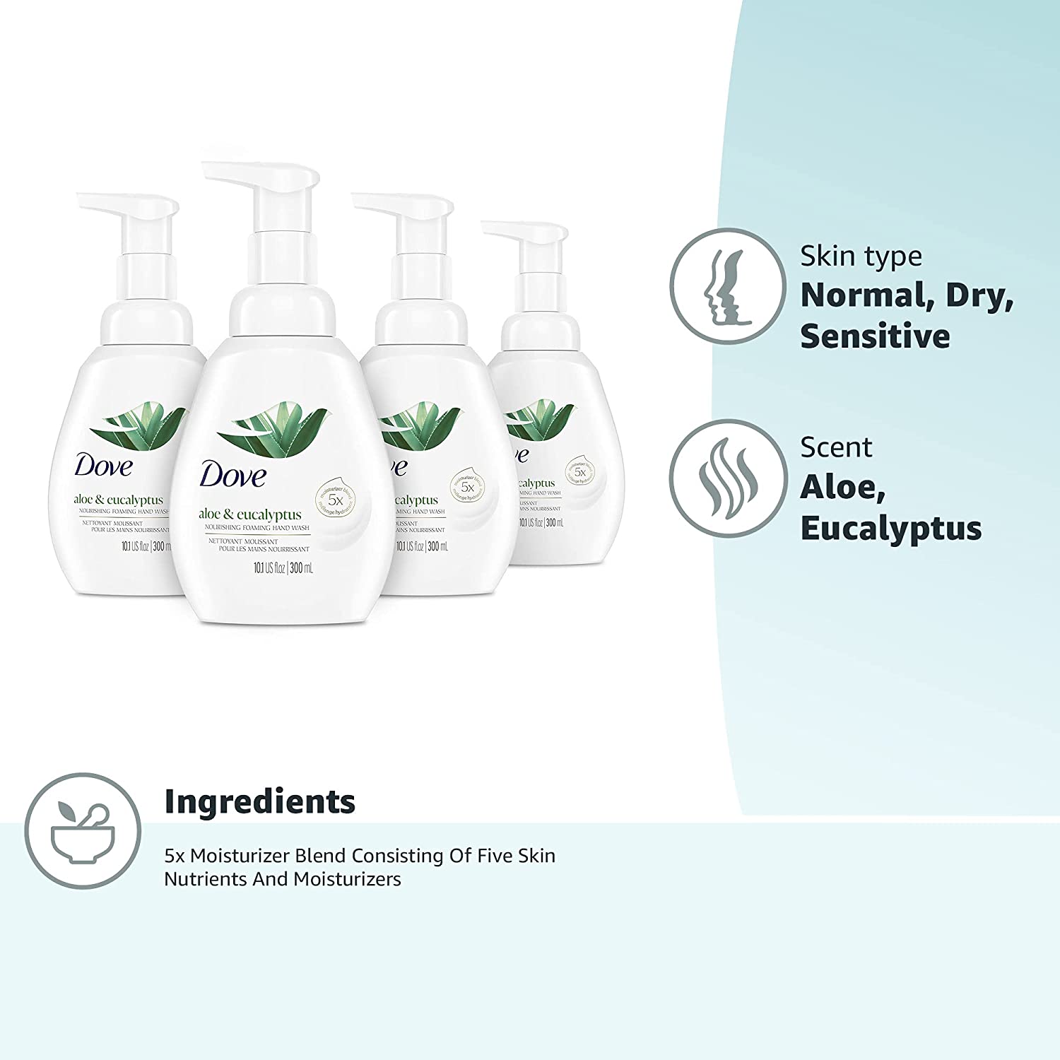 While your average hand soap can cause dry, tight hands, Dove Aloe and Eucalyptus Nourishing Foaming Hand Wash is a great cleanser for dry skin. This gently foaming hand wash offers a rich, indulgent texture that pampers your hands, while effectively washing away dirt and germs. Made with our 5X Moisturizer Blend consisting of five skin nutrients and moisturizers, this hand wash goes beyond cleansing to keep hands soft and nourished, as you wash your hands for the recommended 20 seconds. Dove foaming hand wash is gentle on hands and made with plant-based moisturizers for lasting nourishment. What’s more, this unique formulation includes no sulfates and no parabens. When you buy Dove hand wash or Dove body and bath products, you can also be assured that you're caring for your hands with products that have been certified Cruelty-Free by PETA. Globally, Dove does not test on animals and is certified Cruelty-Free by PETA. Dove is also on a mission to help the next generation of women develop a positive relationship with the way they look, by reaching over 1/4 of a billion young people around the world with self-esteem education by 2030. With Dove, let every hand wash truly be an act of care.