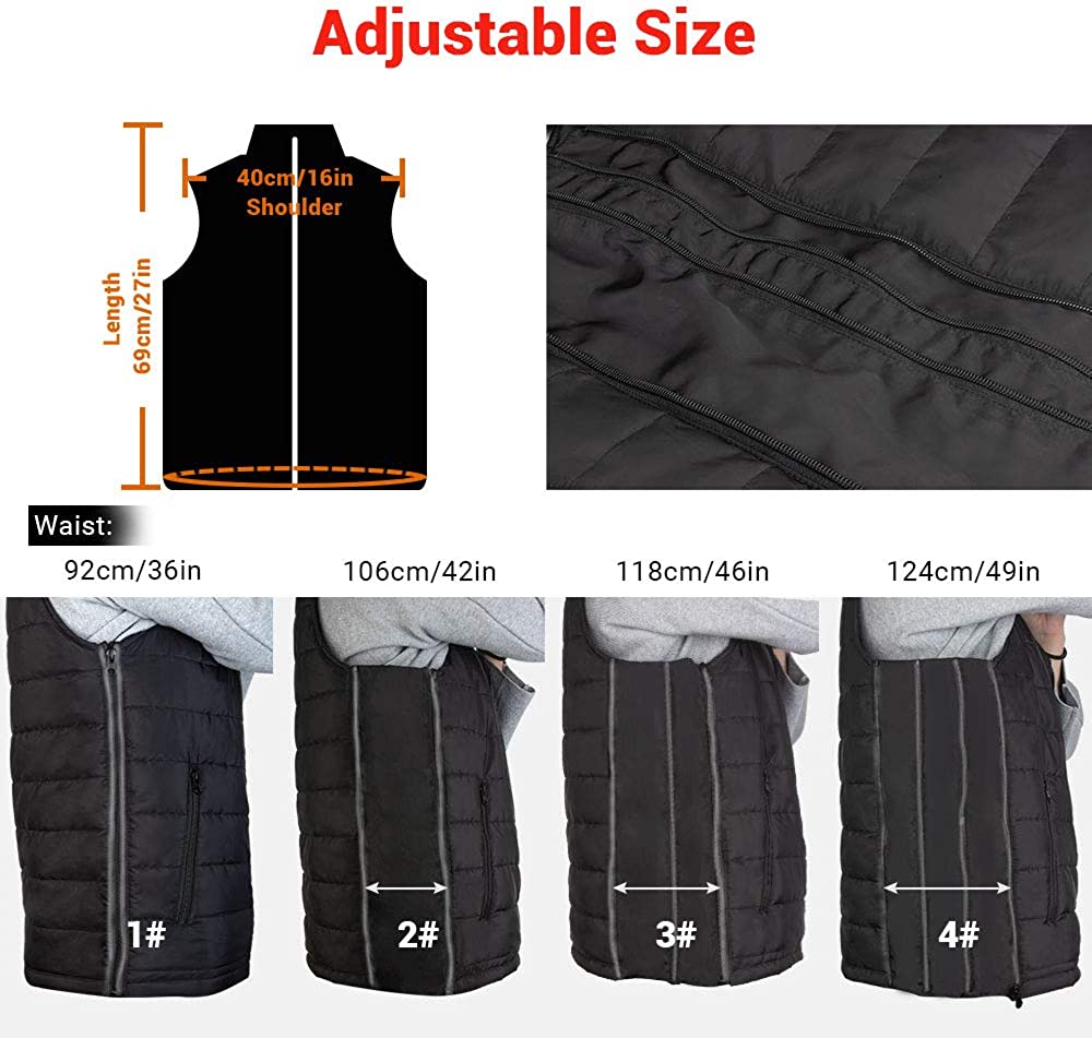 For a combination of functional comfort and quilted design, reach for the Sleeveless Quilted Heated Vest from Dr. Prepare, this unisex heated vest helps you stay cozy and warm. Operation: ※ Please use a portable battery pack (not included) with 2A or 2.4A USB output to power up this heated vest. ※ Step 1. Unzip the inner pocket and take out the USB cable. Step 2. Insert the USB cable into the USB output on the battery. Then push the Power Button on your battery pack to turn it on. The thermal switch on the vest (near your chest) now cycles through red, blue, and green light for once, indicating the heated vest is plugged in. Step 3. Long press the thermal switch for 2 seconds and it will flash red light. The heated vest will enter the AUTO Mode. In AUTO Mode, the temperature of your heated vest will regulate from High to Medium after the red light flashes for 5 minutes. Step 4. If you prefer a certain heating level to the AUTO mode, short press the thermal switch. Then you can adjust temperature settings from High, Medium to Low. The red light stands for high heat. The blue light indicates medium heat and the green light signals low heat. Step 5. Press and hold the thermal switch for 2 seconds to stop the heated vest from heating. Specifications: Name: Heated Vest Input: 5V / 1.9A Rated Wattage: 9.5W Outer Shell: 100% Polyester Filling: 100% Polyester Three Heating Levels: 131°F (High, Red Light), 122°F (Medium, Blue Light) 113°F (Low, Green Light)