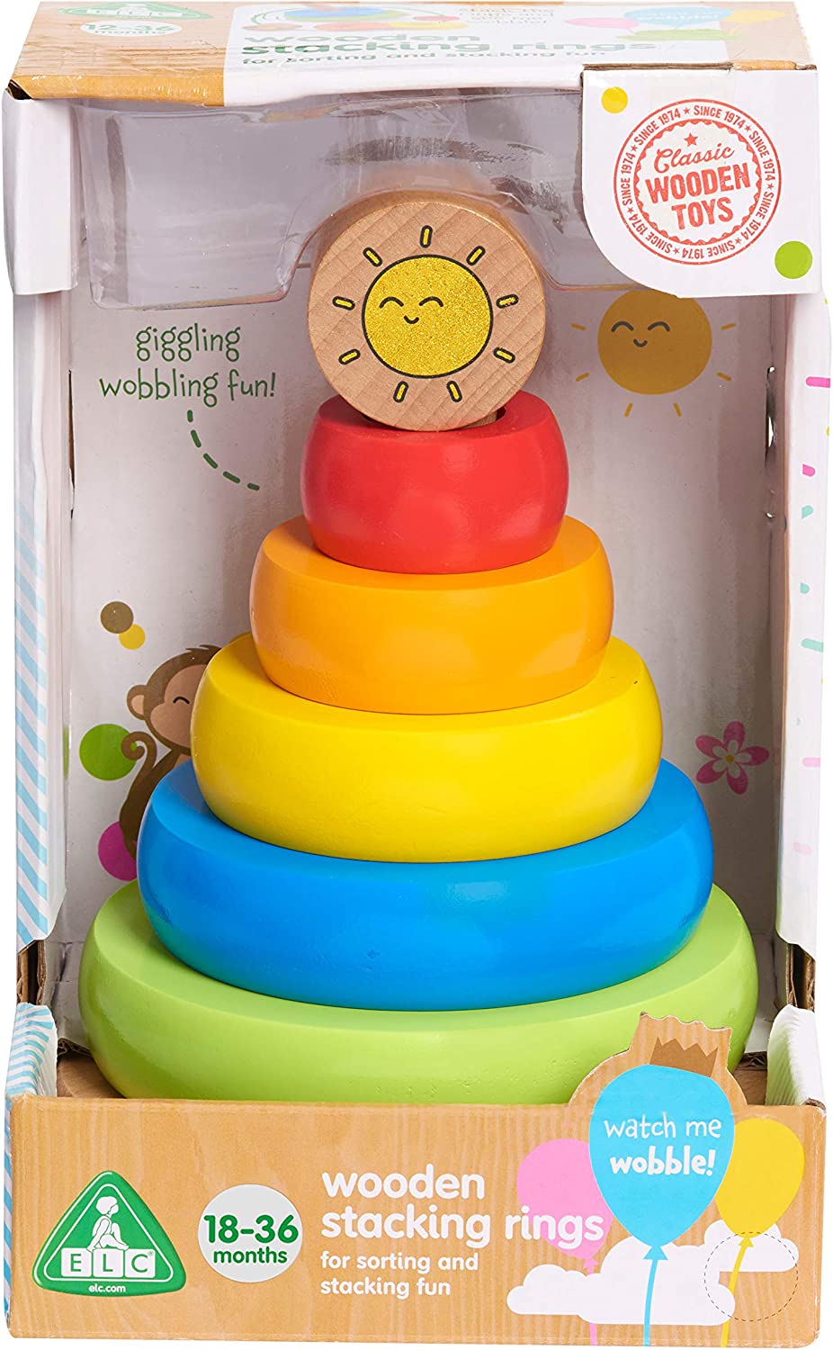 The traditional Wooden Stacking Ring set has been given a wobbly twist to make it even more fun! Stack the five brightly colored, chunky, wooden, stacking rings onto the base as it wobbles about then top it off with the sun topper. This classic wooden toy will encourage children to problem solve and enhances fine motor skills, including boosting reaction time and balance. Count the colorful rings with your child as they stack them on the base and place the little sun on top, then give the toy a push to watch it weeble and wobble around. Ages 18 - 36 months Early Learning Centre is based in the United Kingdom and has been designing and developing high quality, innovative toys since we were established in 1974. We are proud of our heritage and, as a leading specialist of children’s development, we promise to always strive to be that little bit better, and that little bit different.