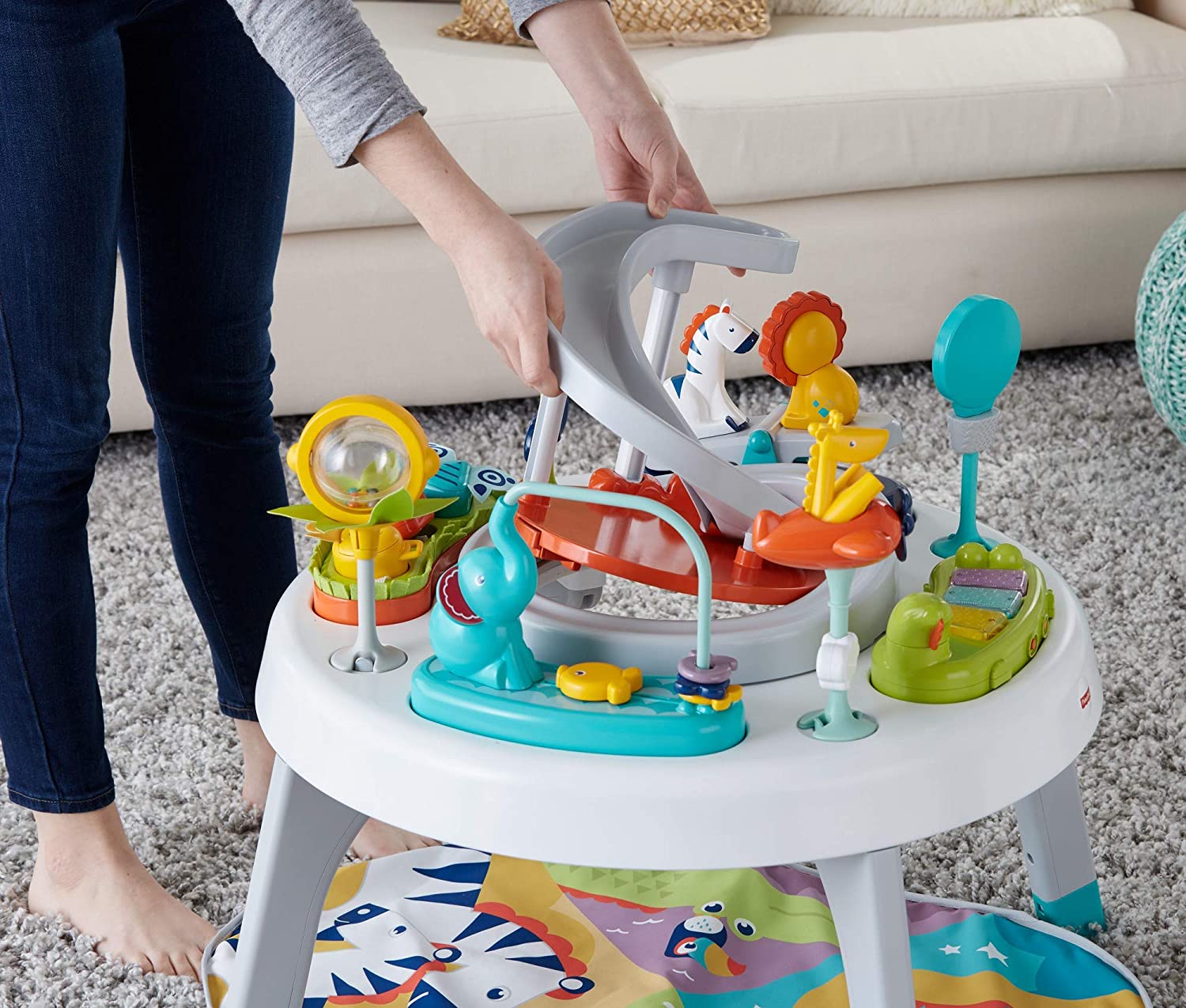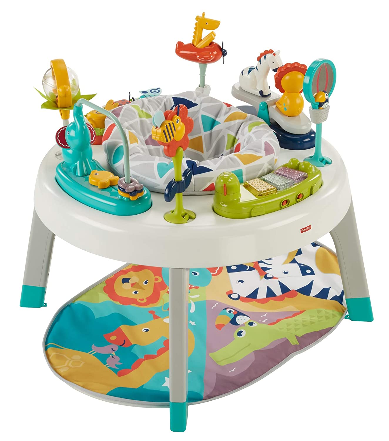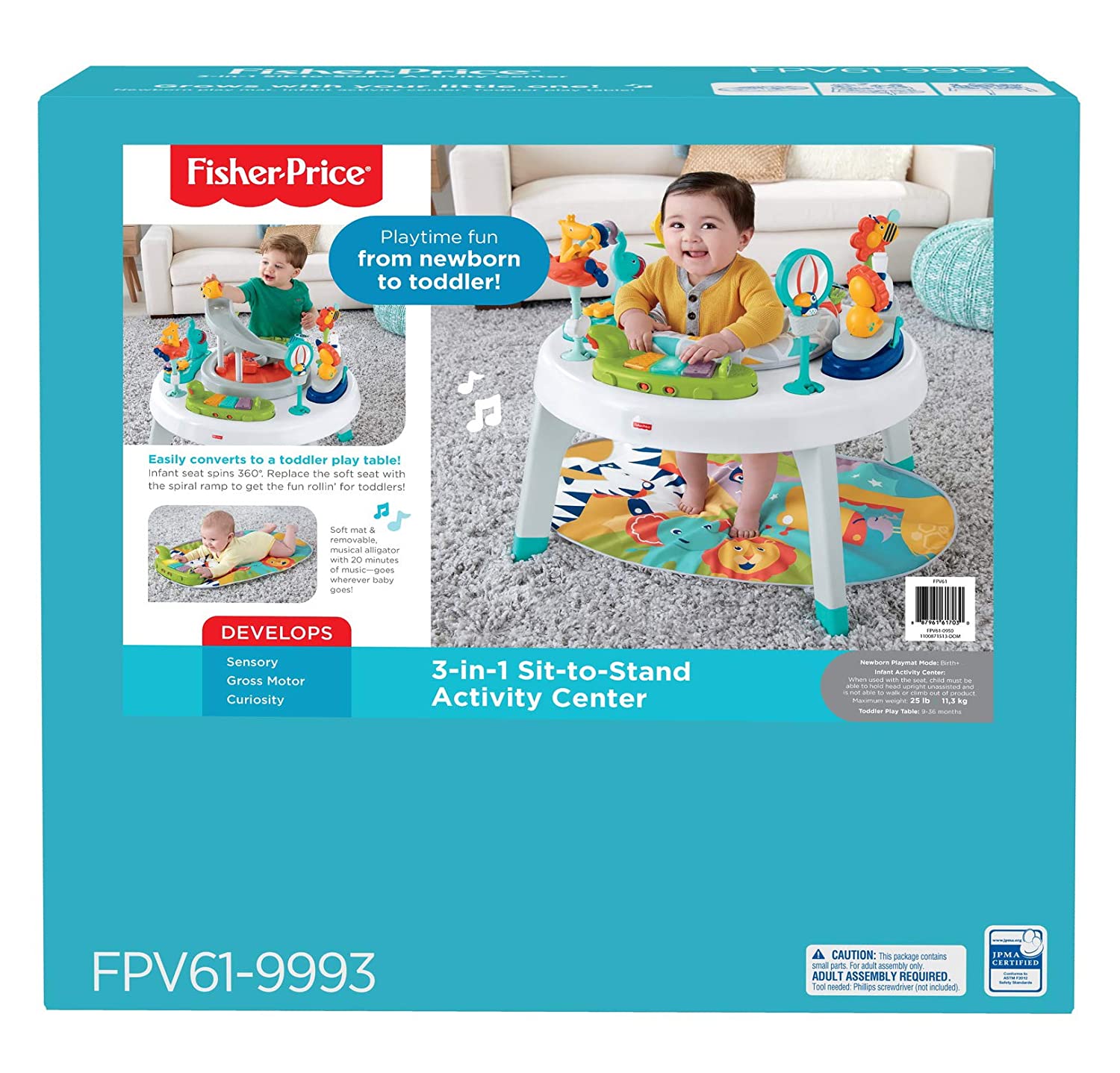 From tummy time, to sitting and spinning, to standing and exploring all around—this 3-in-1, animal-themed activity center will keep your little monkey busy as can be! The soft play mat and musical alligator are perfect for teeny ones to lay and play, while the fabric seat allows older babies to spin around and discover all 360 degrees of exciting toys and activities. And with an add-on ramp with shape-sorter bugs to send sliding down, toddlers can keep the good times rolling! Where development comes into play Gross Motor: Little muscles get a big workout as they go from sitting and reaching & interacting with the activities to pulling up to a stand and cruising around the table. Sensory: Bright, cheery colors and playful lights and sounds engage your baby's developing senses. Curiosity: As little ones explore the variety of activities, from making music with the alligator to rolling the bugs down the ramp, they're introduced to cause and effect! Use only with a child who can hold head up unassisted and who is not able to walk or climb out of product.
