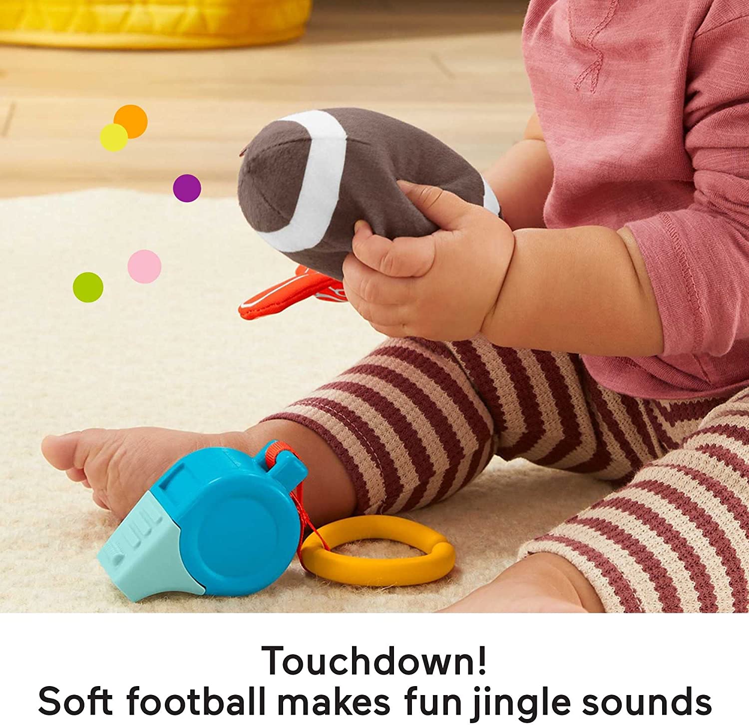 Call a fun-filled play for your little football fan with the Fisher-Price Tiny Touchdowns Gift Set. This set of 3 infant activity toys includes a crinkly fan finger, a whistle teether, and a soft, squishable football that jingles when fumbled. Baby will love exploring all of the fun textures and sounds, practicing their gross motor skills as they do!