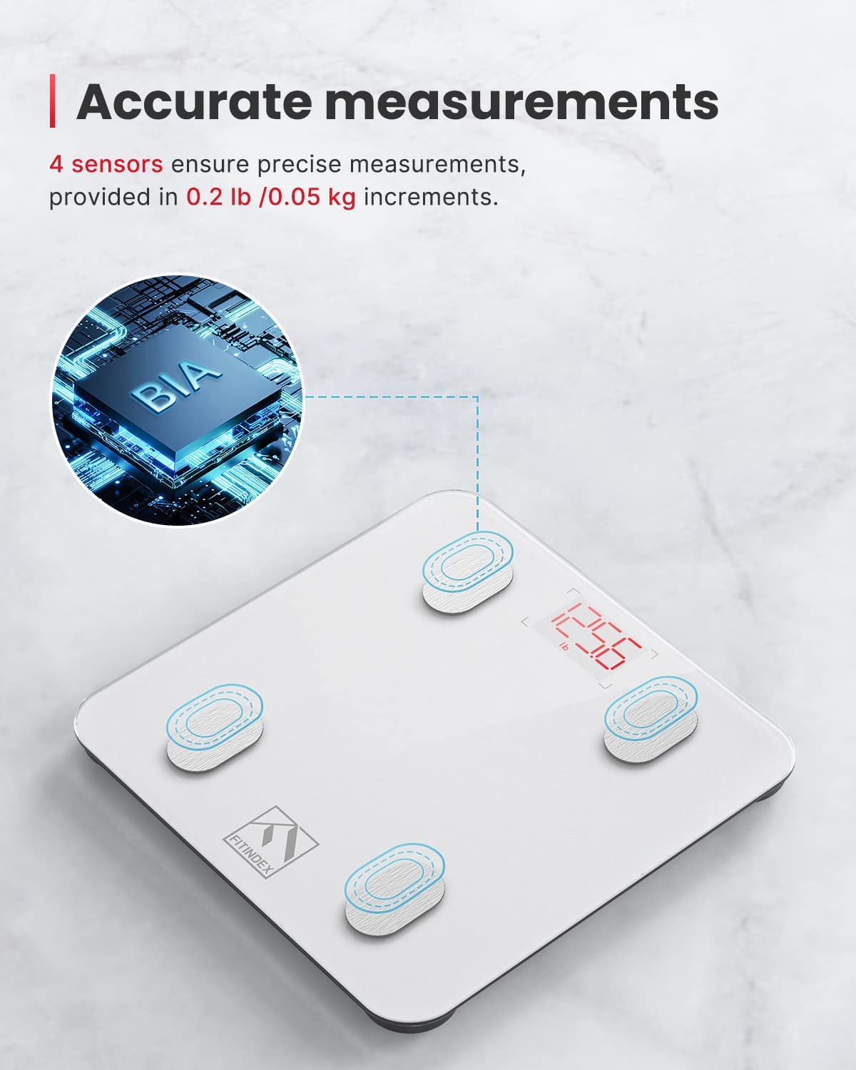 FITINDEX Bluetooth Body Fat Scale, Smart Wireless BMI Bathroom Weight Scale Body Composition Monitor Health Analyzer with Smartphone App for Body Weight, Fat, Water, BMI, BMR, Muscle Mass - White