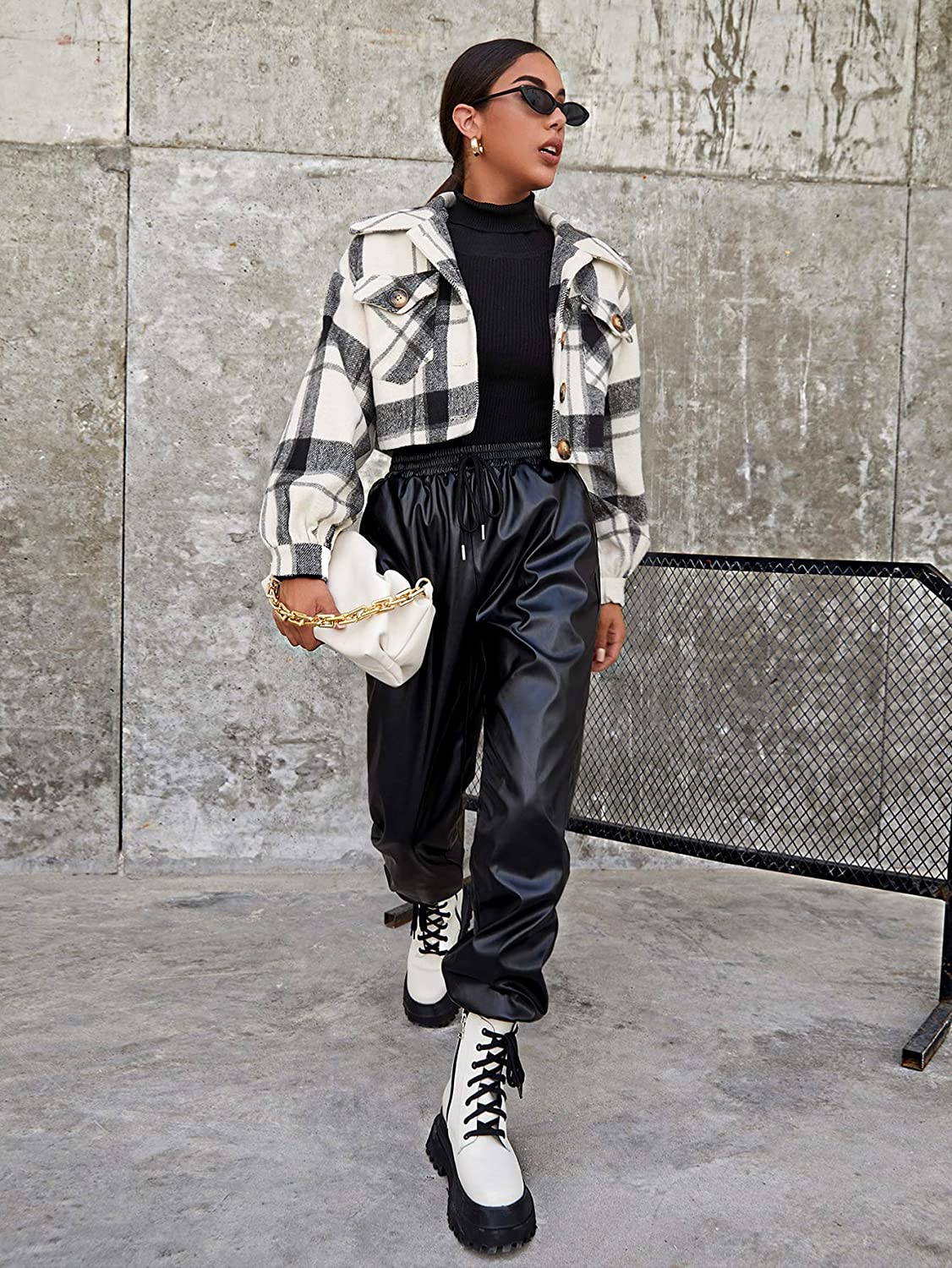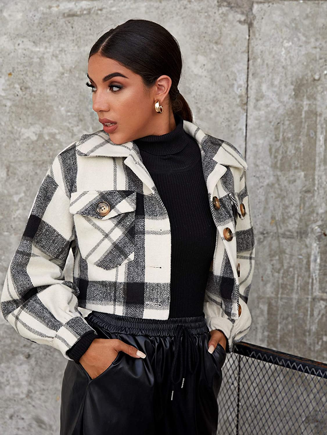Floerns Women's Buffalo Plaid Button Front Patch Pocket Crop Jacket Coat