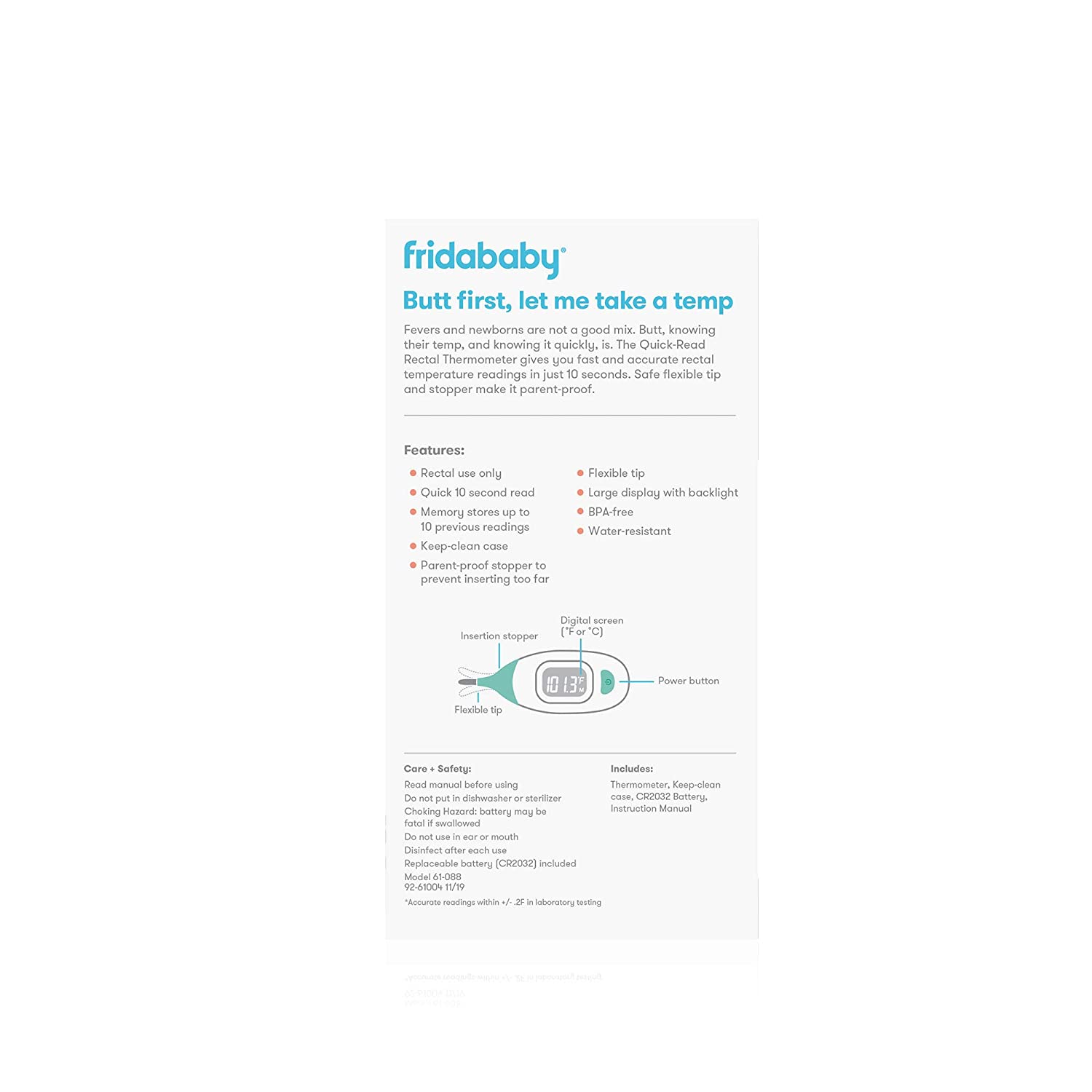 Fevers and newborns are not a good mix. Butt, knowing their temp, and knowing it quickly, is. The Quick-Read Rectal Thermometer gives you fast and accurate rectal temperature readings in just 10 seconds. Safe flexible tip and stopper make it parent-proof.