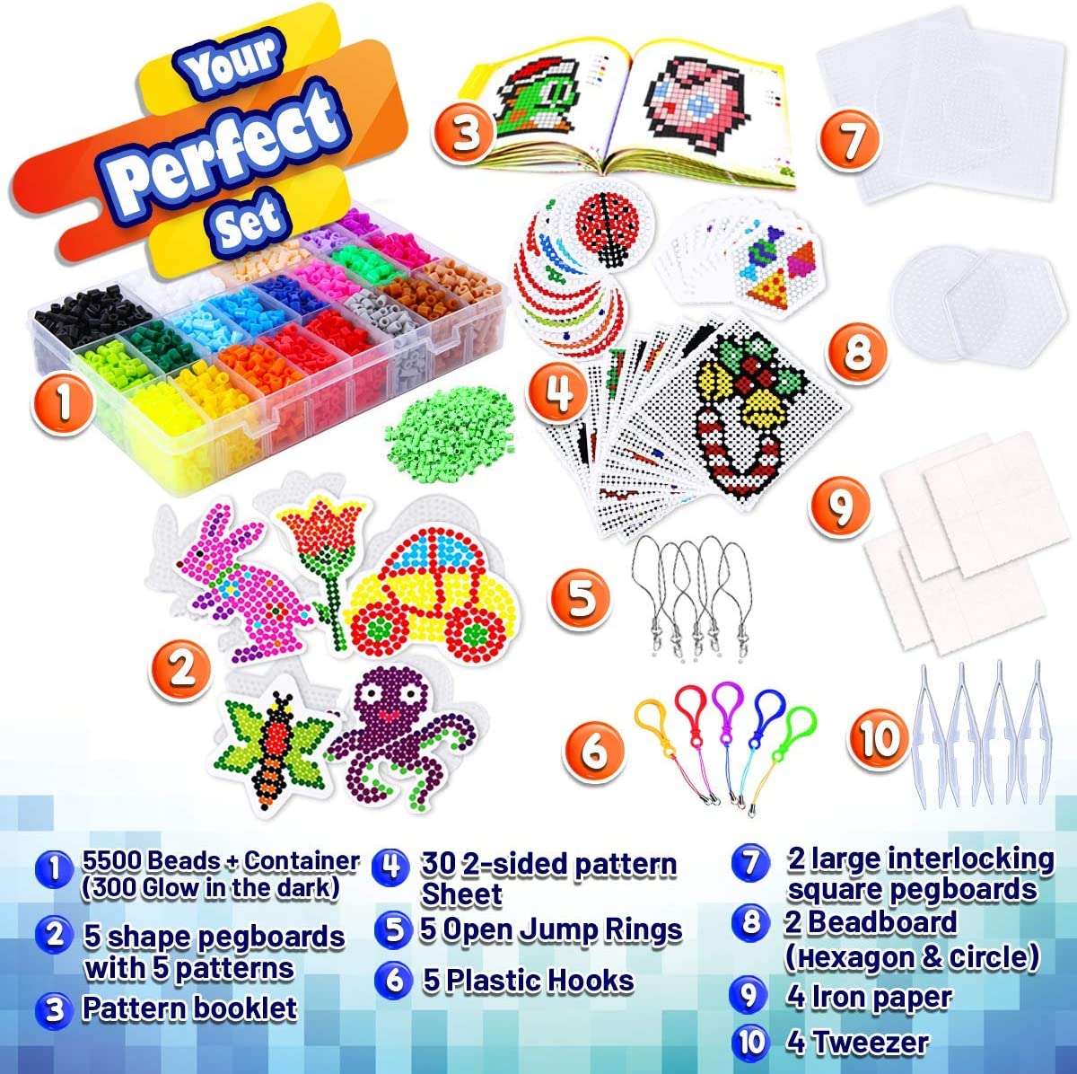 FunzBo Fuse Beads Craft Kit - 111 Patterns Melty Fusion Colored Beads Arts and Crafts Pearler Set for Kids - 5500 5mm Bead 9 pegboards for Boys Girls Age 5 6 7 Classroom Activity Gift (Large)