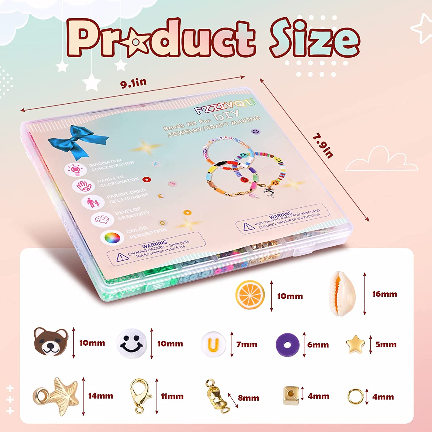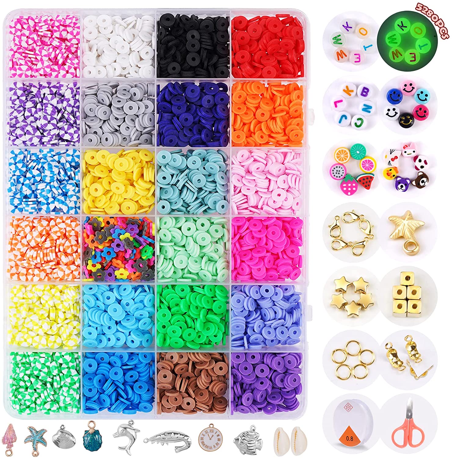 FZIIVQU Clay Heishi Beads Kit with Smiley Face Beads for Bracelets Making 5280+ Polymer Preppy Flat Clay Beads for Jewelry Making Set Lnclude UV Letter Beads & Fruit Animal Gold Star Spacer Beads etc
