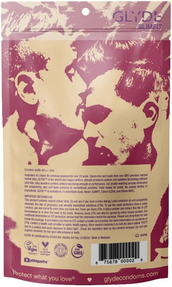 The smallest condom on the market GLYDE SLIMFIT condoms are designed for men who prefer a snugger fit, or require a narrower, tighter condom. GLYDE SLIMFIT are sized at 49mm for a form-fitting ultra reliable, ultra sensitive experience - feels great for both partners! Lightly lubricated with reservoir tip. All GLYDE condoms are made from 100% natural latex Fair Trade sourced rubber and thistle extract . Certified ethical and vegan by the Vegan Society, GLYDE condoms are free of animal testing and animal by-products, chemicals, parabens, or spermicides. Each condom is double washed to eliminate odor, and features patented technology for strength and durability which exceeds global standards. GLYDE SLIMFIT is available in packs of 12, 36 or 100. Distributed by GLYDE America.