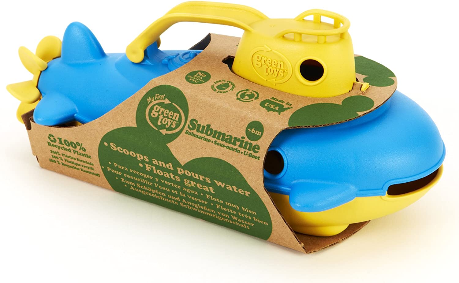 Take the helm of the Green Toys Submarine for a nautical journey to help protect the planet. Submerge it underwater to explore the terrain at the bottom of the tub and let it resurface to scan the horizon in search of the next adventure. Made in the USA from 100% recycled plastic milk jugs that save energy and reduce greenhouse gas emissions, this sturdy watercraft features a spinning rear propeller, a flat bottom for added stability, and the classic handle and wide-mouth opening combination for plenty of scoop and pour fun. The cabin can be opened for easy cleaning, while the whole vessel is also dishwasher safe. No BPA, phthalates, PVC or external coatings and also meets FDA food contact standards. Packaged with recycled and recyclable materials and printed with soy inks. Recommended for ages 6 months and above. Dimensions: 10.5"L x 5.5"W x 4"H.