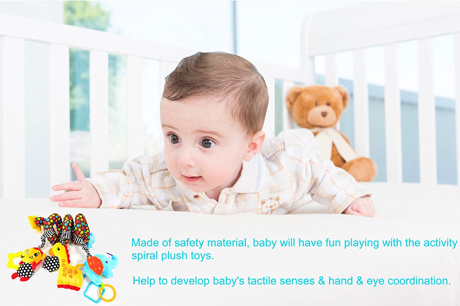 Multi-Use: Such cute toys can be easily wrapped around baby crib bed, stroller, carrier and car seat. It would be a great toy to coax the infant from crying to laughing.
