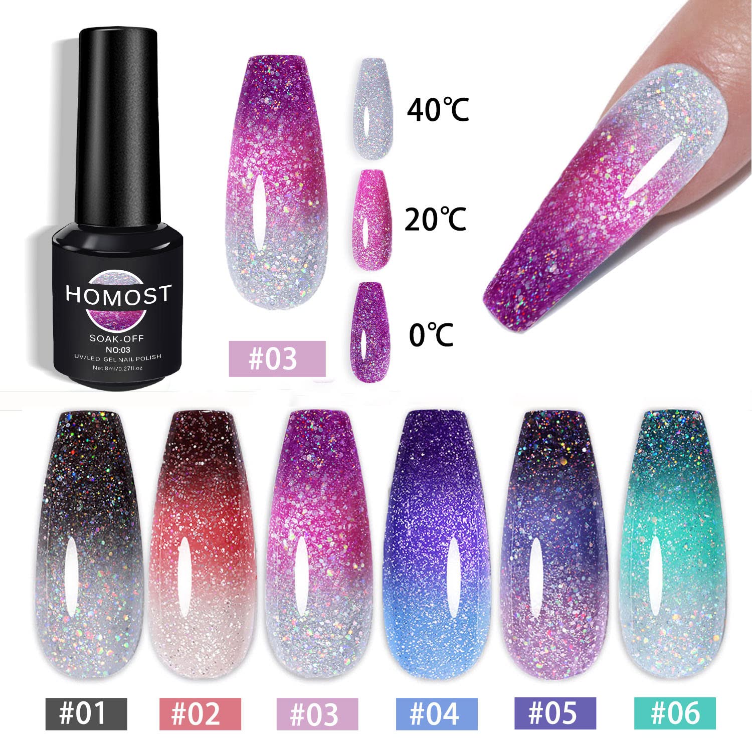 HOMOST Color Changing Reflective Glitter Diamond Gel Nail Polish Set, 6 Colors Glitter Gel Polish Reflective Pink Purple Blue Nail Polish Kit
