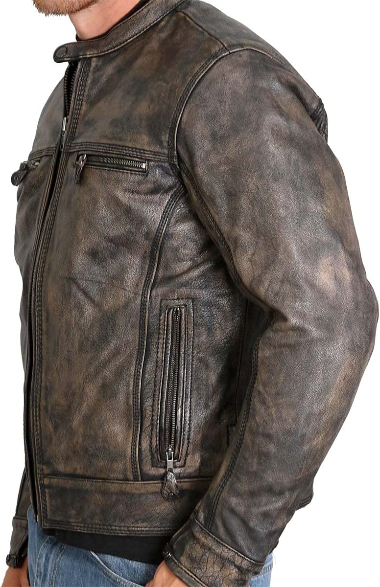 Hot Leathers JKM1019 Men's Distressed Brown Leather Jacket with Gun Pockets A men's brown racing jacket in a heavyweight, top grain leather with zip-out quilted lining for added comfort. The jacket also includes a stand-up racing collar with snaps, 4 zipper pockets, two inside concealed carry pockets, zipper cuffs and 4 zipper vents. This jacket does not come with leather zipper pull extensions. Heavyweight top grain leather Stand-up racing collar with snaps 4 zipper pockets Two inside concealed carry pockets Zipper cuffs and 4 zipper vents