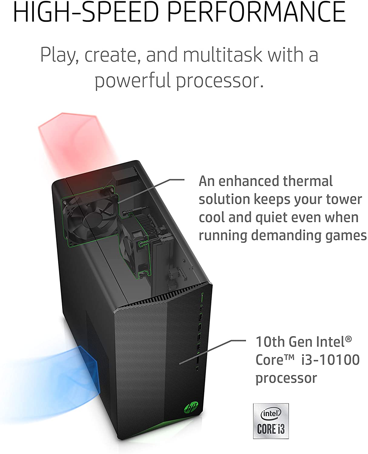 Game on your own terms with the HP Pavilion Gaming Desktop. This gaming tower has all the space you need to easily expand or upgrade, letting you keep up with the games of tomorrow. Personalize your gaming pc in the OMEN Command Center as you manage your machine’s key metrics and customize the chassis lighting. Intel’s powerful 10th Generation processor with a Max Turbo Frequency of 4.30 GHz delivers smooth and outstanding 4k visuals. Your gaming and streaming will never be the same because your HP desktop boasts an NVIDIAⓇ GeForceⓇ GTX 1650 SUPER™ graphics card and 4 GB GDDR6 dedicated memory. PCIe® NVMe™ SSD Storage makes your gaming pc desktop 10x faster than a traditional hard drive while 8 GB DDR4 memory gives a boost to your browsing and multitasking. Your setup has never been more modern with the Windows 10 operating system, USB wired mouse and keyboard combo, and smoother wireless experience with both Wi-Fi 5 and Bluetooth® 4.2. Easily pair your HP Pavilion Gaming Desktop with a MU-MIMO router for a smoother online experience in multi-device homes. Play care-free with a 1-year limited hardware warranty. Introducing Windows 11 (1) Windows 11 is coming! A new Windows experience, bringing you closer to the people and things you love. Get a sneak peek now! (1) Upgrade rollout plan is being finalized and is scheduled to begin late in 2021 and continue into 2022. Specific timing will vary by device. Certain features require specific hardware.