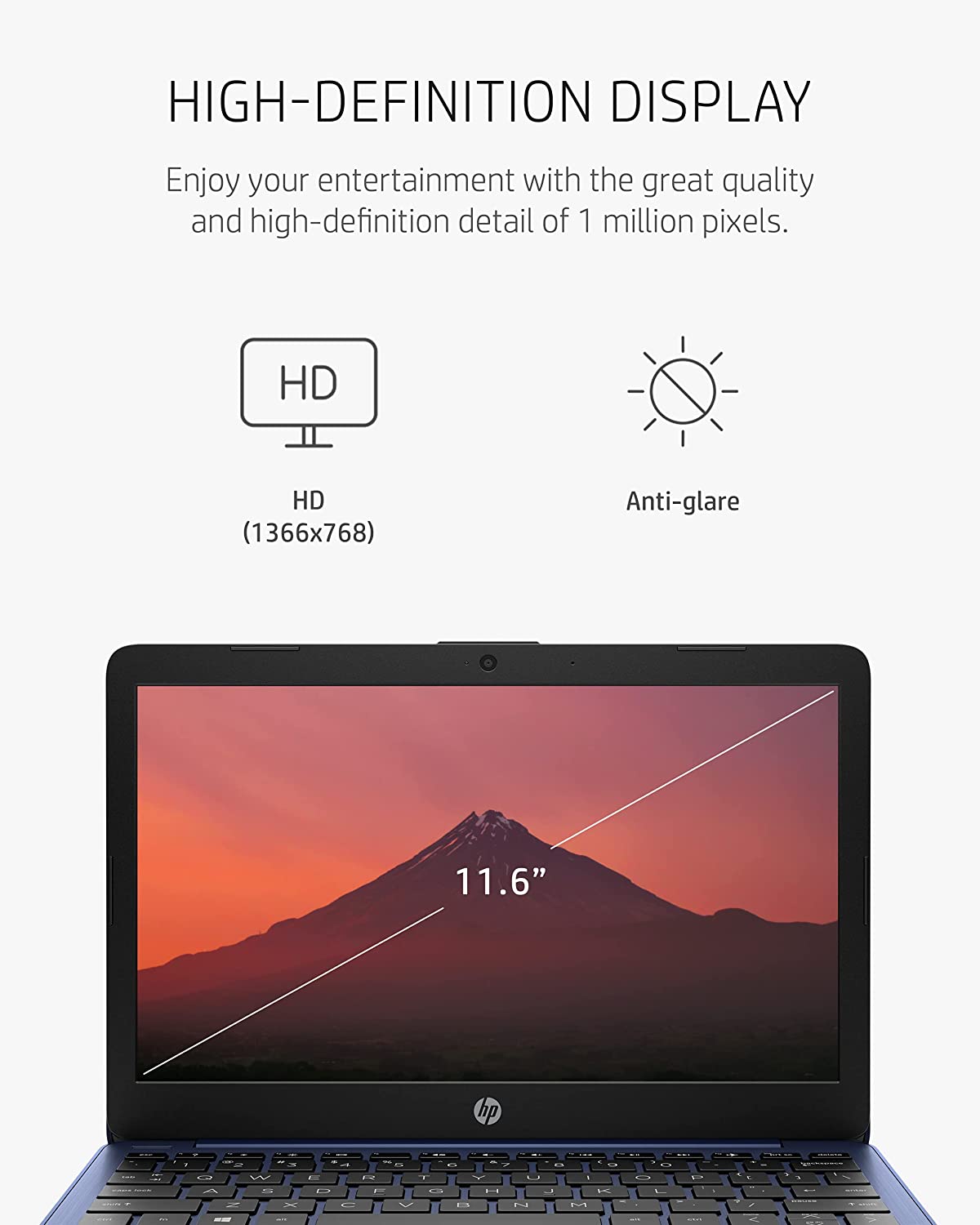 Live your best life on the go and in style with the slim and expressive HP Stream 11 Laptop. With its smooth finish, vertical brushed pattern, and pop of Royal Blue color, this windows laptop perfectly fits your personality. The design isn't only for looks; the ultra-thin laptop is super portable and its high-definition display contains an anti-glare panel—perfect for travel and computing out in the sun (1). This affordable HP laptop features powerful and reliable hardware, such as the dual-core Intel® Celeron® N4020 processor (2) and Intel® UHD Graphics 600 (3). Plus, with an embedded Multimedia Card, you’ll enjoy 64 GB of storage for greater content security, fewer moving parts, and at a great value (4). Additionally, experience a boost to your 11.6-inch laptop’s overall performance and bandwidth thanks to 4 GB of RAM. And with up to 13 hours and 15 minutes of battery life, you’ll enjoy all that processing power and storage options from the start of your workday to the end of your evening streaming (5). Experience quicker boot-ups and strong protection against phishing and malware with the Windows 11 Home in S Mode (6). Plus, your device's 1-year limited hardware warranty provides even more peace of mind. Whether you’re at home, the office, or in class, the dependable Realtek RTL8822CE 802.11a/b/g/n/ac (2x2) Wi-Fi® (7) and Bluetooth® 5.0 (8) combo is just the solution for preventing unwanted connection drops or waiting on endless load screens. Take advantage of a free 1-year subscription to Microsoft 365 and utilize the many new smart assistance tools and other creativity promoting features this HP laptop computer has to offer (9). Stay productive anywhere while shrinking your carbon footprint with a PC laptop that's not only built with sustainability in mind, but is also ENERGY STAR® certified (10) and EPEAT® Silver registered (11). (1) High-definition (HD) content is required to view high-definition images. (2) Multi-core is designed to improve the performance of certain software products. Not all customers or software applications will necessarily benefit from the use of this technology. Performance and clock frequency will vary depending on application workload and your hardware and software configurations. Intel’s numbering, branding, and/or naming is not a measurement of higher performance. Intel, Pentium, Intel Core, Celeron, Iris Xe, Intel logo, and the Intel Inside logo are trademarks of Intel Corporation in the U.S. and other countries. (3) Shared video memory (UMA) uses part of the total system memory for video performance. System memory dedicated to video performance is not available for other use by other programs. (4) For storage drives, GB = 1 billion bytes. The actual formatted capacity is less. Up to 5.1GB of disk is reserved for system recovery software. (5) Battery life tested by HP using continuous FHD video playback, 1080p (1920x1080) resolution, 150 nits brightness, system audio level at 17%, player audio level at 100%, played full-screen from local storage, headphone attached, wireless on but not connected. Actual battery life will vary depending on configuration and maximum capacity will naturally decrease with time and usage. (6) Not all features are available in all editions or versions of Windows. Systems may require upgraded and/or separately purchased hardware, drivers, software, or BIOS update to take full advantage of Windows functionality. Windows 11 is automatically updated, which is always enabled. ISP fees may apply and additional requirements may apply over time for updates. See http://www.windows.com. Windows 11 in S mode works exclusively with apps from the Microsoft Store within Windows. Certain default settings, features, and apps cannot be changed. Some accessories and apps compatible with Windows 11 may not work (including some antivirus, PDF Writers, driver utilities, and accessibility apps) and performance may vary, even if you switch out of S mode. If you switch to Windows 11, you can’t switch back to S mode. Learn more at Windows.com/SmodeFAQ. (7) Wireless access point and internet service required and sold separately. The availability of public wireless access points is limited. Wi-Fi 5 (802.11ac) is backward compatible with prior Wi-Fi 5 specs. (8) Bluetooth® is a trademark owned by its proprietor and used by HP Inc. under license. (9) Microsoft 365 Personal 1-year subscription included. Activation is required within 180 days of the Windows activation date. Microsoft 365 Family and Microsoft 365 Personal have non-commercial rights and are meant for personal use only. See microsoft.com for full details. (10) ENERGY STAR and the ENERGY STAR mark are registered trademarks owned by the U.S. Environmental Protection Agency. (11) Based on U.S. EPEAT® registration according to IEEE 1680.1-2018 EPEAT®. EPEAT® status varies by country. Visit www.epeat.net for more information.