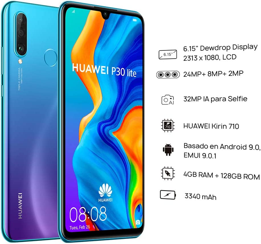Huawei P30 Lite (128GB, 4GB RAM) 6.2" Display, AI Triple Camera, Dual-SIM Global GSM Factory Unlocked Phone - Peacock Blue