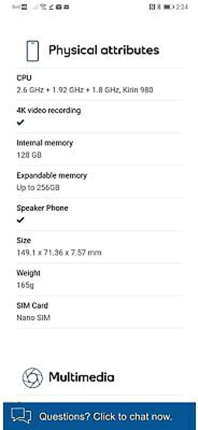 4G FDD LTE: Bands 1/2/3/4/5/6/7/8/9/12/17/18/19/20/ 26/28/32 4G TDD LTE: Bands 34/38/39/40 3G WCDMA: Bands 1/2/5/8/4/6/19 3G TDS: Bands 34/39 2G GSM: Bands 2/3/5/8(850/900/1800/1900 MHz). GSM only Leica Quad Main Camera | 40MP + 20MP + 8MP + TOF cameras, The Leica quad camera and the latest light fusion sensor technology create breathtaking photos in extreme low light and night time conditions All new HUAWEI 3D modelling and 3D object interaction - dance with scanned objects 8GB Ram, 128GB Rom, Kirin 980, 4200 mah battery, DUAL SIM *This phone will work on GSM SIM cards like AT&T or T-Mobile or any other GSM SIM Card network provider but it will NOT work on CDMA such as Sprint, Verizon or US Cellular or Boost Mobile or any other CDMA Networks.
