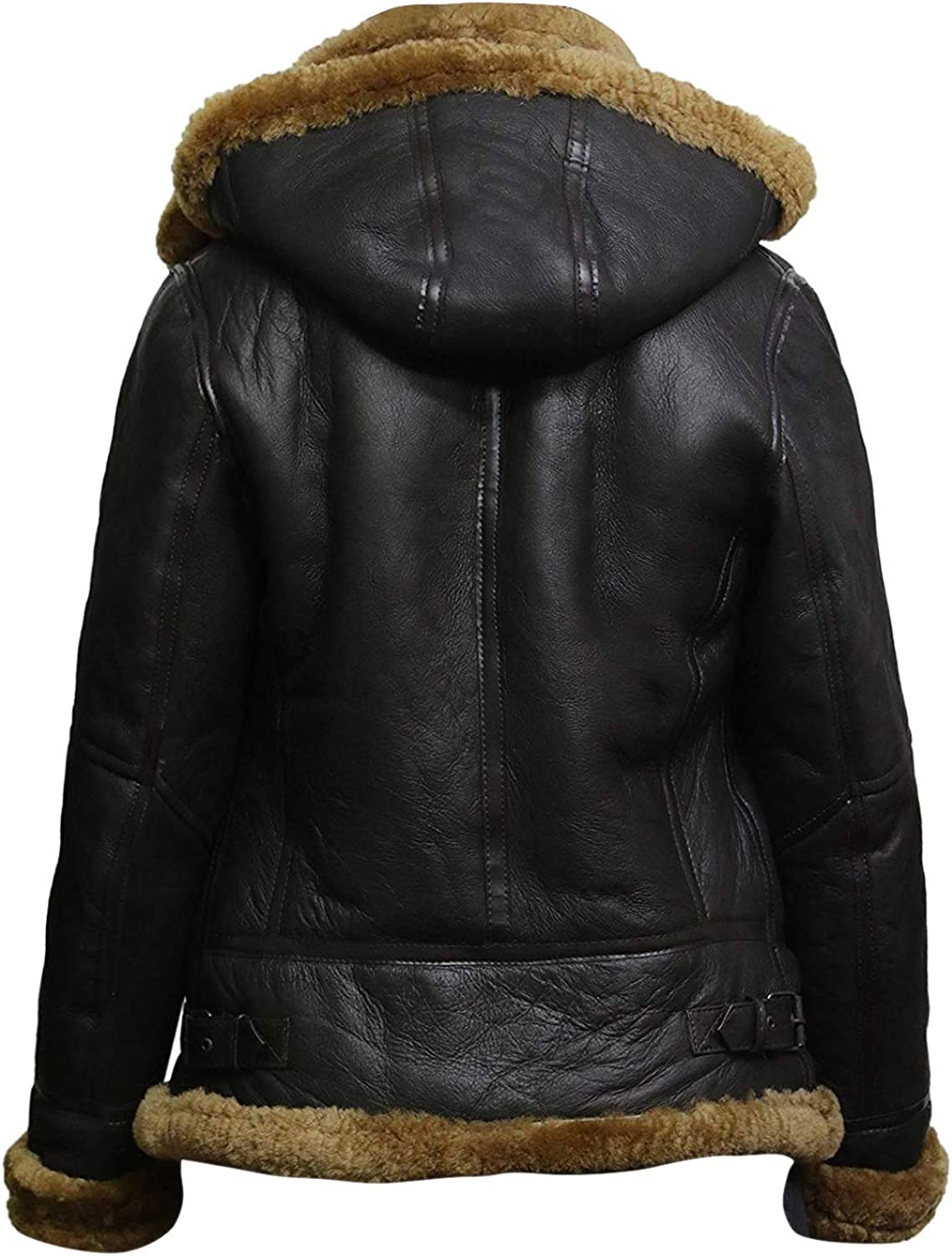 III-Fashions Womens B3 Fur Shearling Aviator Pilot Removable Hoodie Genuine Sheepskin Flight Bomber Brown Leather Jacket
