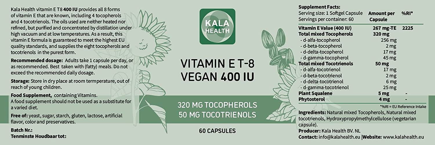 Kala Health Vitamin E 400 370 mg IU Vegan Capsules Tocopherol and Tocotrienol complex contains all 8 Tocopherols and Tocotrienols: Alpha Tocotrienol, Beta Tocotrienol, Gamma Tocotrienol, Delta Tocotrienol, Alpha Tocopherol, Beta Tocopherol, Gamma Tocopherol, Delta Tocopherol.