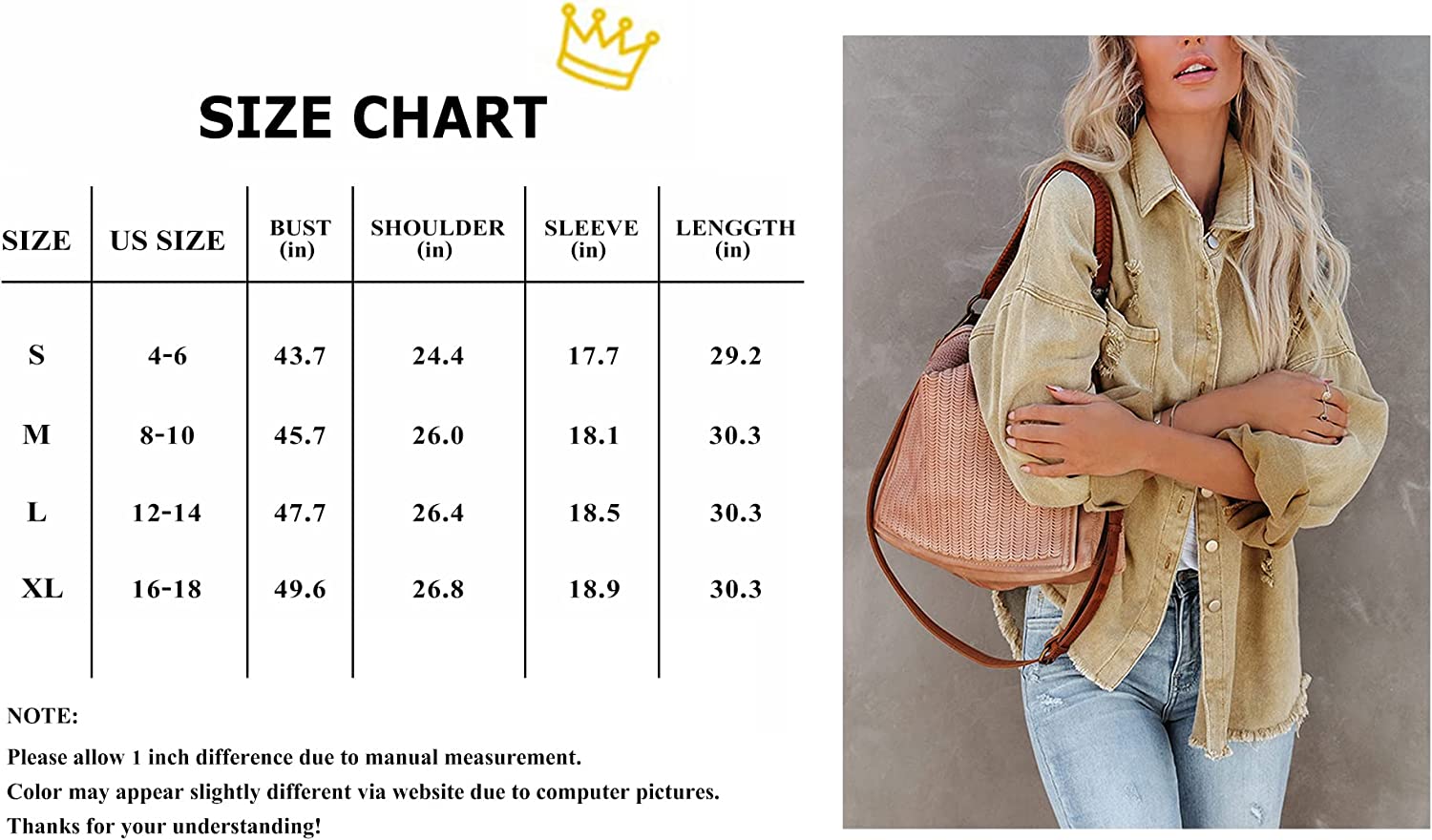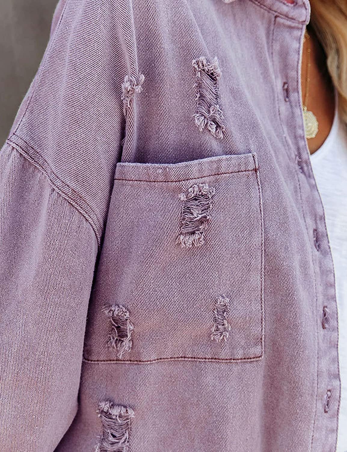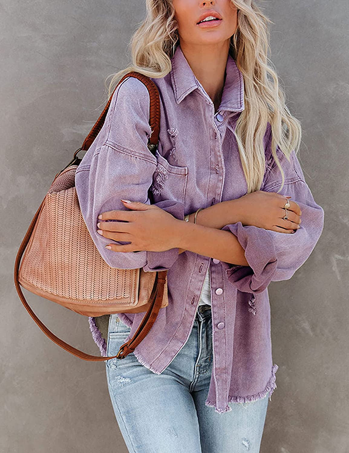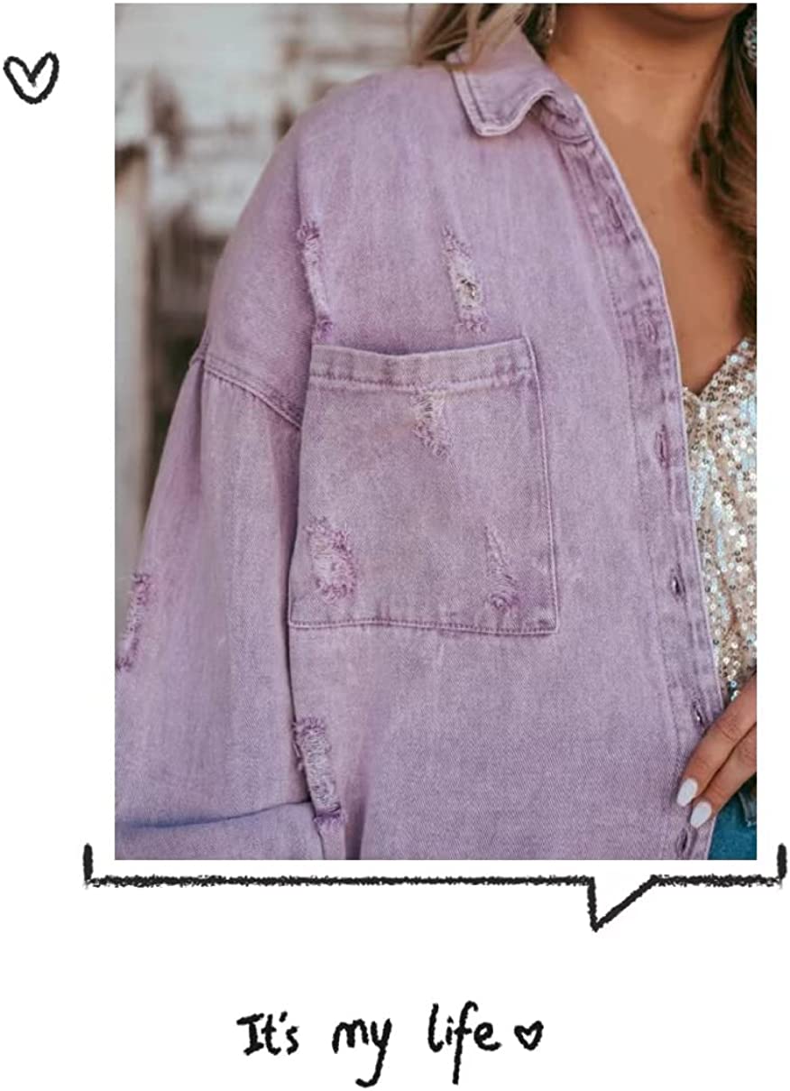 Lumister Womens Causal Oversized Soft Lightweight Distressed Jean Jacket Ripped Fringe Long Sleeve Denim Jacket Shacket
