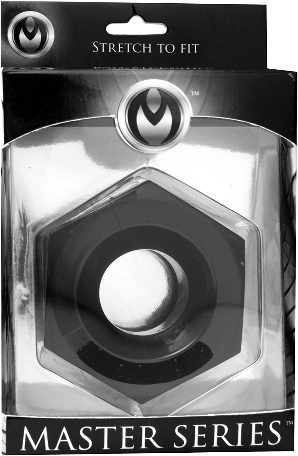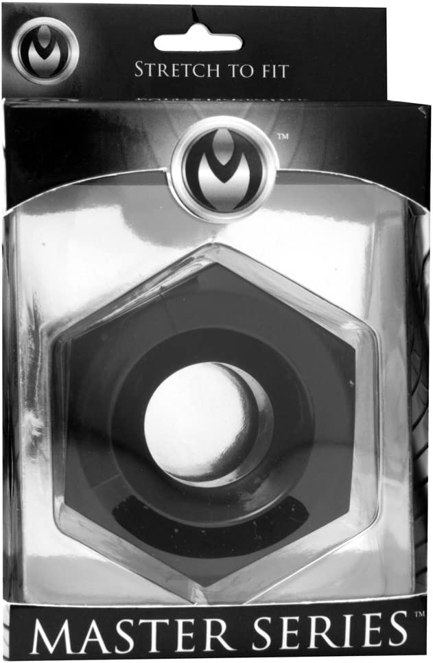 Designed for long lasting erections with its tight fit, this nut is definitely one for the toolbox. Made from firm yet stretchy TPE so it gives just enough to offer maximum erection enhancement while fitting to your body. The hexagonal shape adds a unique look to your cock while helping you maintain an erection for extended sessions. Hex can also be worn as a ball stretcher. Use your imagination. Measurements: 2.3 inches outer diameter, 1 inch inner diameter unstretched, 1.25 inches in width. Material: TPE. Color: Black.