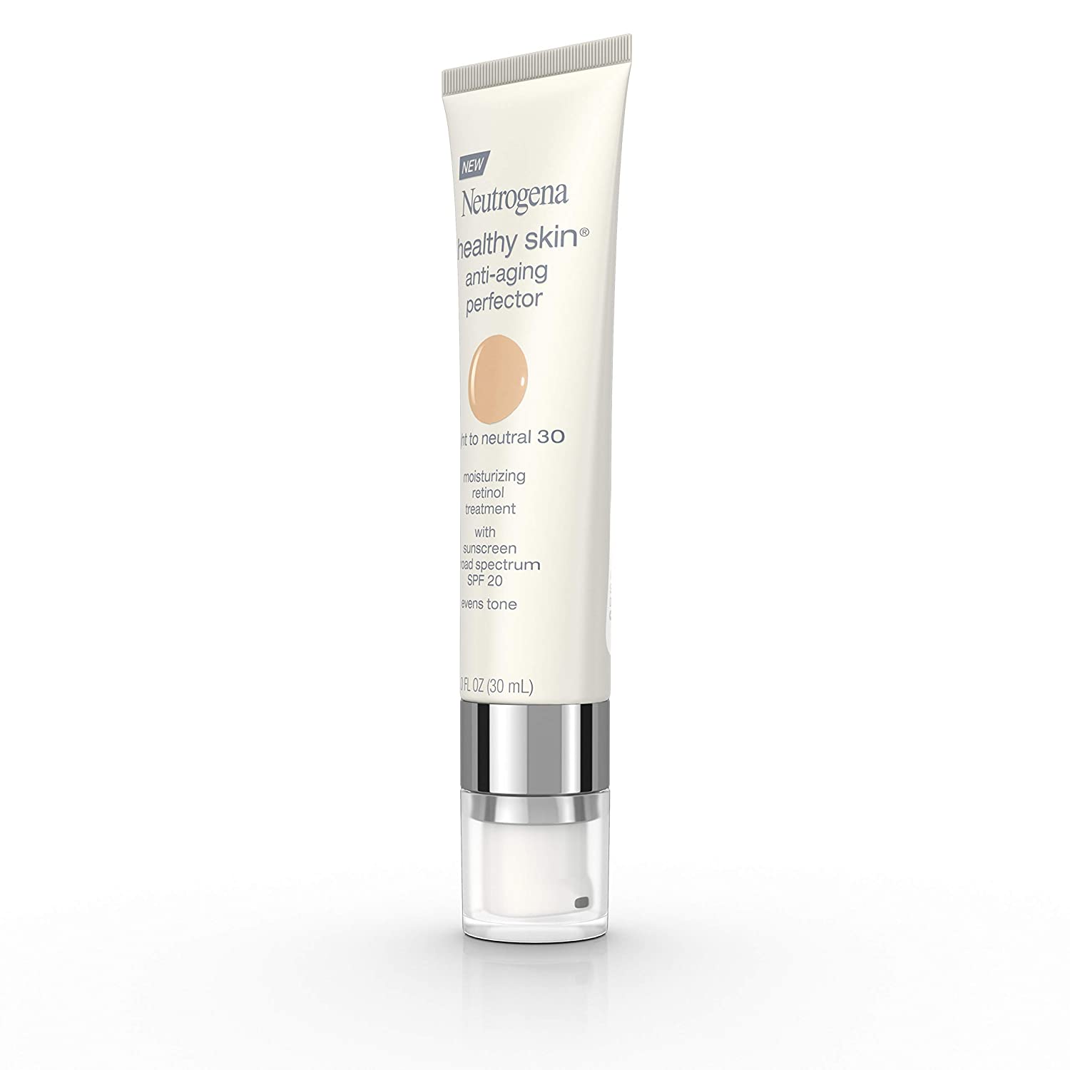 Use Neutrogena Healthy Skin Anti-Aging Perfector Tinted Facial Moisturizer with SPF 20 sunscreen to help reduce the appearance of fine lines. This all-in-one daily moisturizer combines the anti-aging properties of retinol with an SPF 20 moisturizer to offer blendable sheer coverage that helps even tone and smooth skin's texture while protecting against skin-damaging sunrays. This tinted moisturizer is enriched with clinically proven retinol treatment as well as vitamins and antioxidants to fight the appearance of wrinkles even after you take it off. Neutrogena Healthy Skin Anti-Aging Perfector SPF 20 works across skin tones for a natural, dewy finish with sheer coverage.
