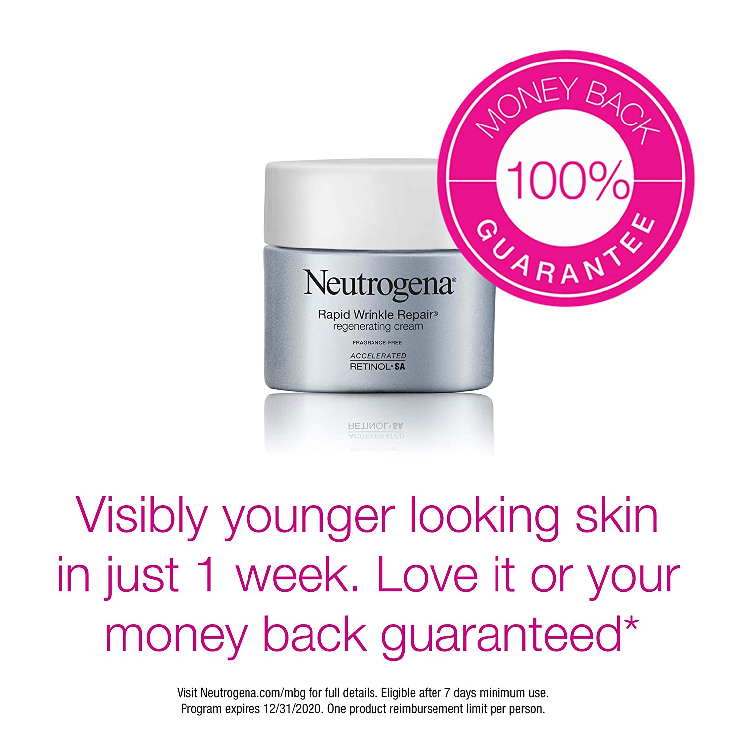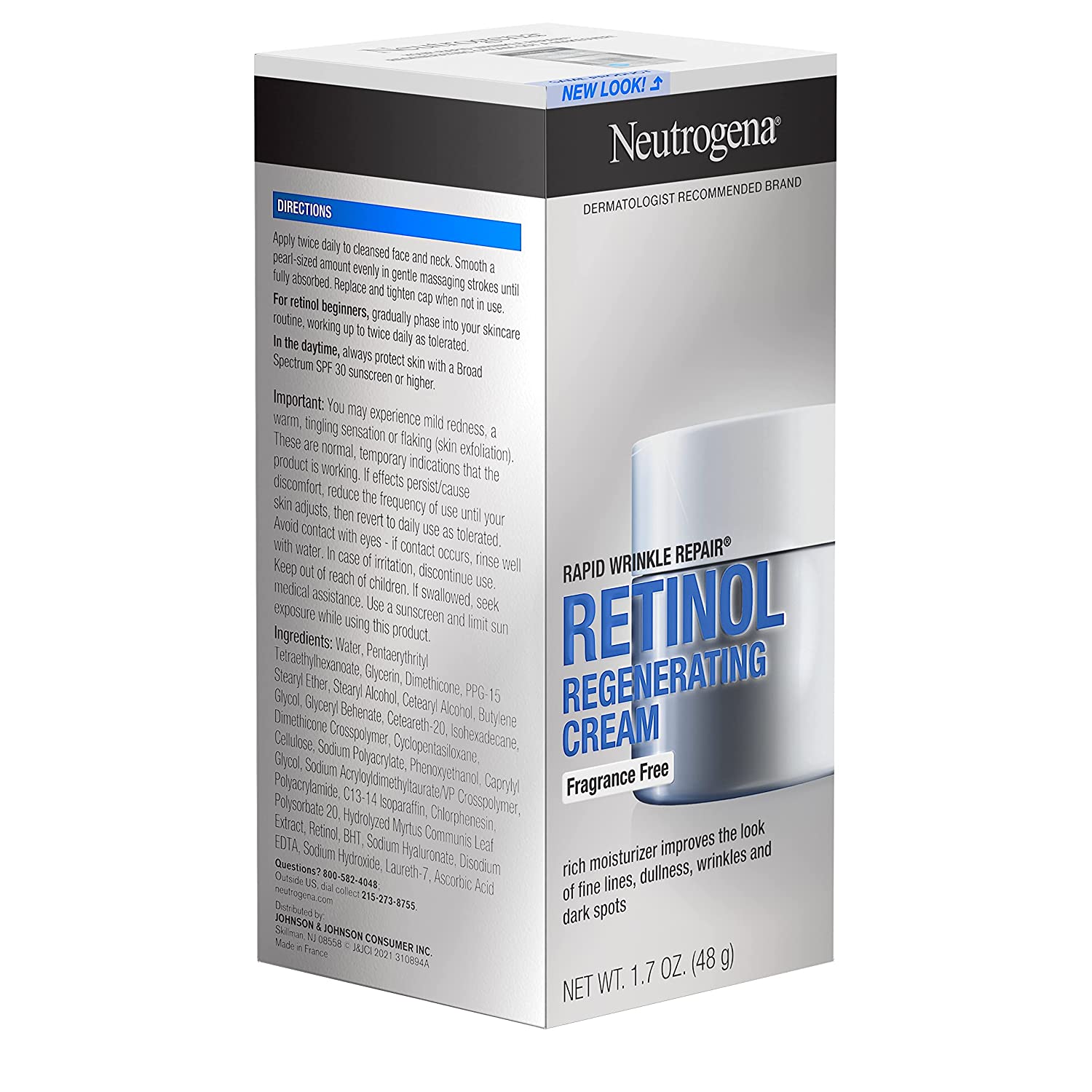 Get visible results with Neutrogena Rapid Wrinkle Repair Retinol Regenerating Cream. This fragrance-free anti-wrinkle face & neck cream smooths the look of fine lines and provides moisture-rich replenishers. The retinol face & neck cream helps fade the look of deep wrinkles, including crow's feet and forehead and cheek wrinkles. Our clinically proven anti-wrinkle formula, this rich fragrance-free facial moisturizer delivers retinol, a dermatologist-proven form of vitamin A and powerful ingredient that fights fine lines, dullness, wrinkles and dark spots, deep within skin's surface quickly and effectively, for visibly smoother and younger-looking skin in just one week. Hyaluronic acid adds plumping moisture to help hydrate and rejuvenate the look of skin. Regenerating Retinol Cream is suitable for daily use in a skincare routine on all skin tones. Plus, it is free of parabens, mineral oil and dyes and comes from the #1 retinol brand used most by dermatologists.